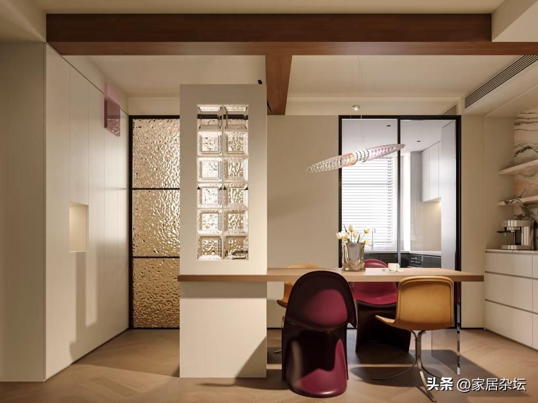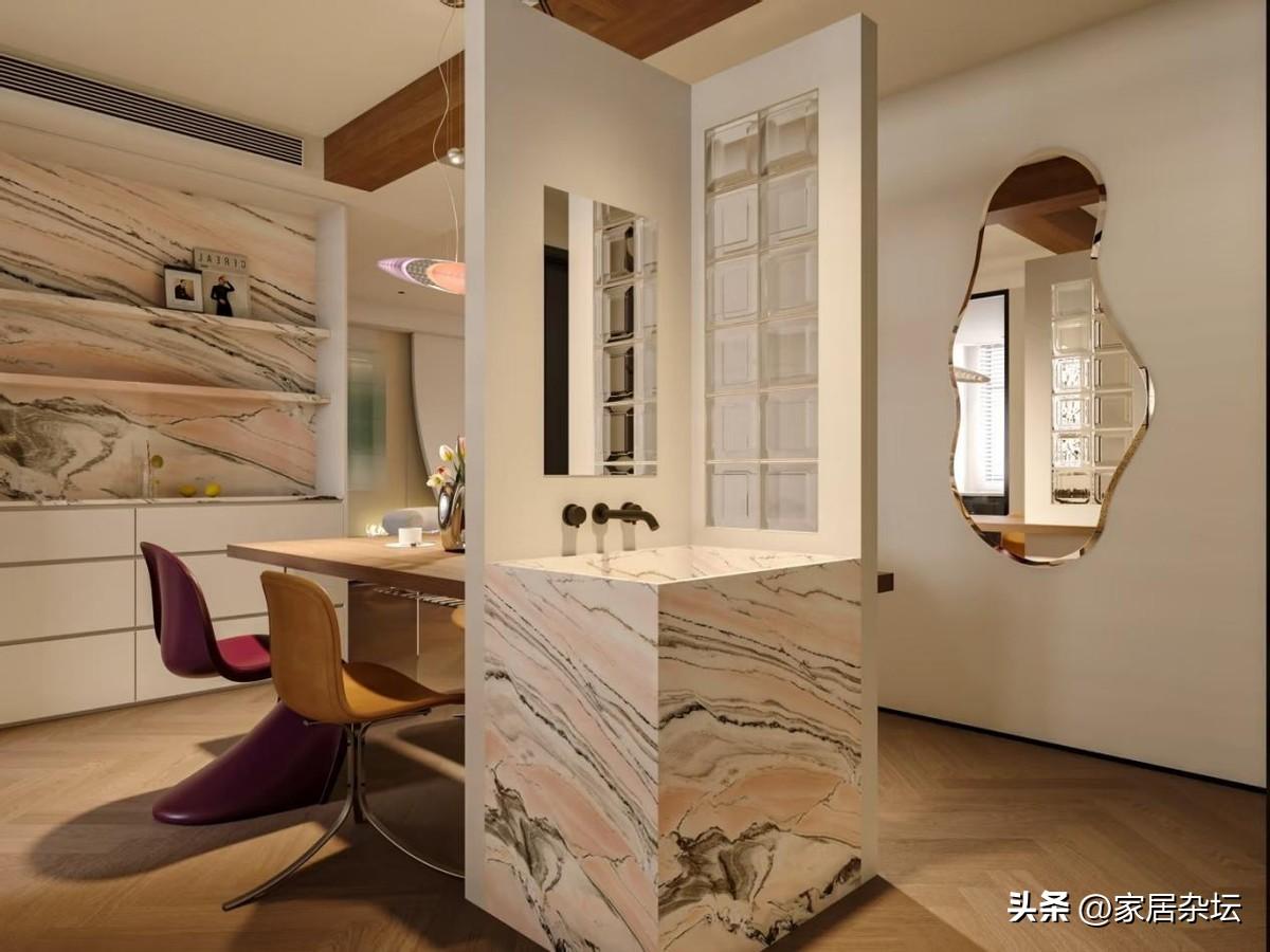 可能很多朋友不知道怎麼做,其實佈局也不是很難。可以採取中島延伸式,廚房中島延伸出1~1.2米作爲專屬洗漱段;餐邊櫃整合式,在餐邊櫃中嵌入洗手盆;過渡區式,在廚房、餐廳過渡區牆面設置洗漱區。