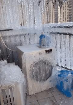 上面的網友就是沒有封陽臺,把洗衣機放在陽臺後都被冰封住了……