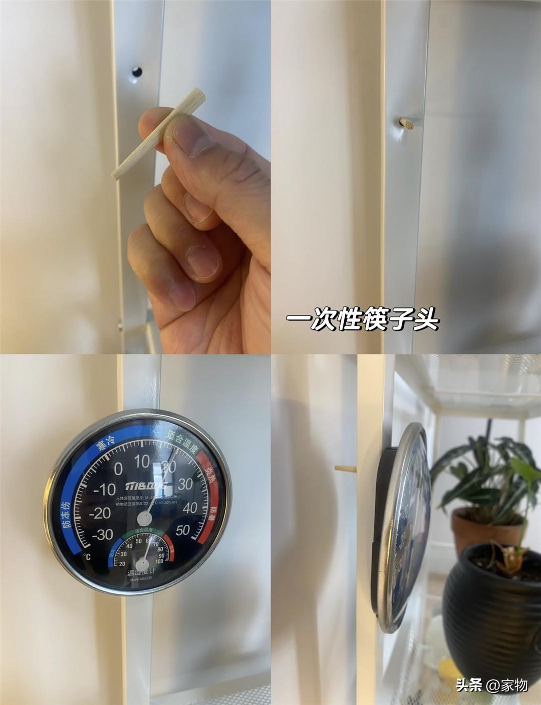 別的不說,直接穿在溫度計上,在卡在花架上、桌子腿上用來調節高度的螺絲眼上,變成了一個天然的溫溼度劑量屏,你別說,越看越合適。