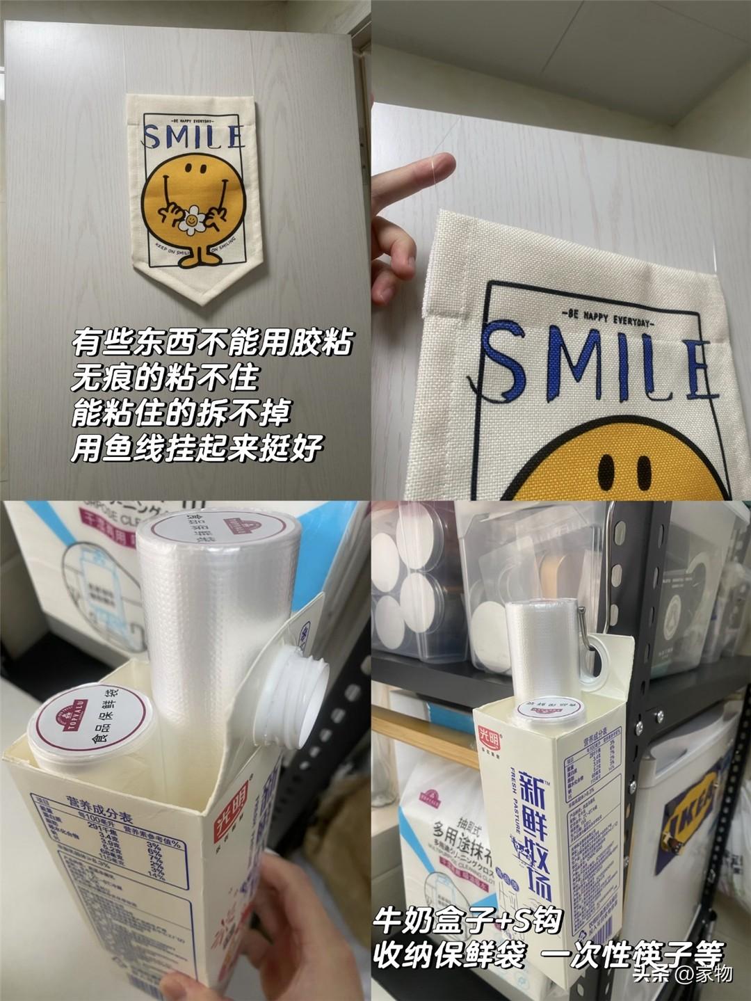 家裏有很多看上去是貼在牆面櫃面的東西,其實都是用魚線掛起來的,它又細又透明,掛東西真的看不出來,也相當於是隱藏收納了。