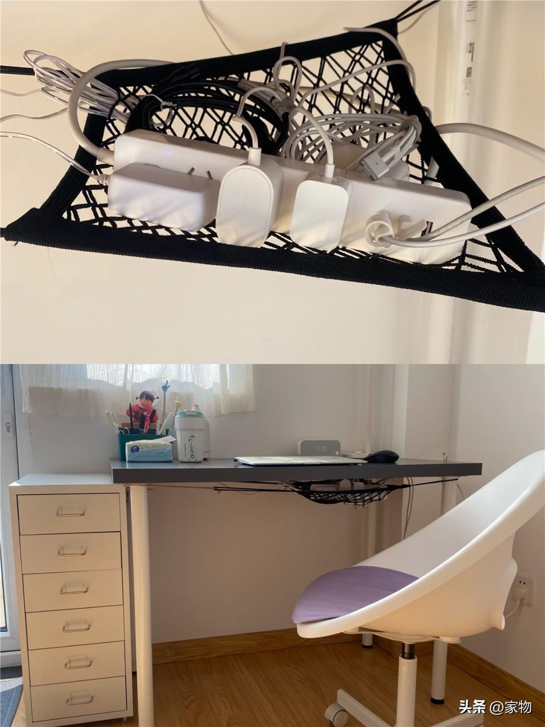 現在的各種桌面小電器和線材越來越多,桌面也隨之越來越亂,與其費盡心思整理桌面上的線材,倒不如給桌子安個帶彈力的網兜,將充電器、充電線統統掛在桌底。