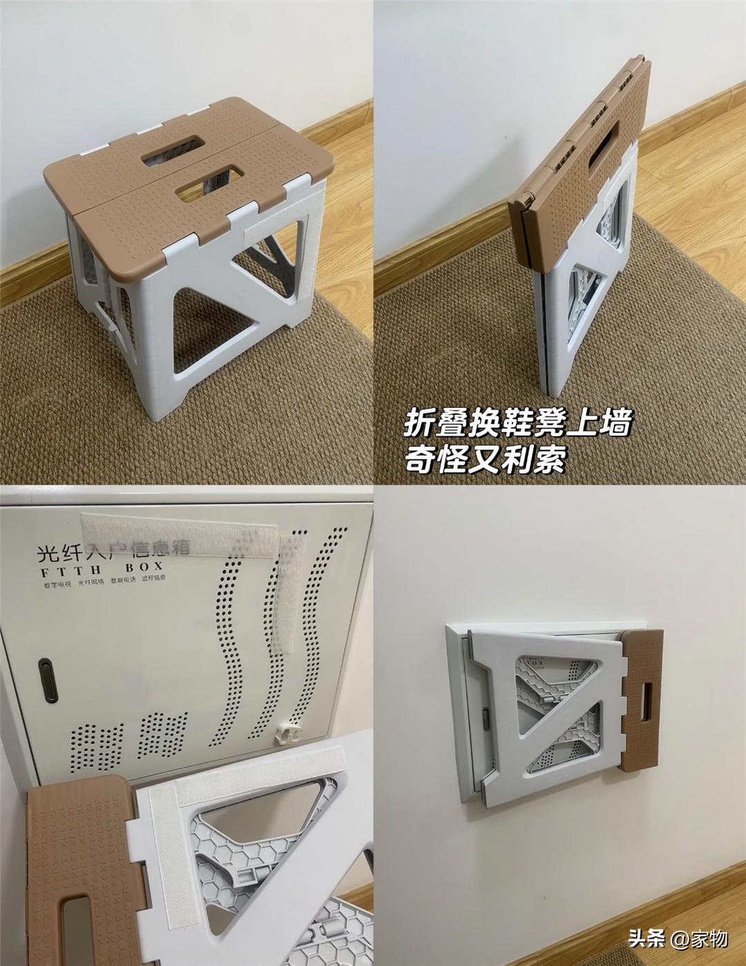 還不如學學老媽,直接在摺疊凳上貼魔術貼,另一邊貼在電錶箱上,用完後就粘上去,既起到遮擋作用,又讓玄關多了個摺疊換鞋凳,一物兩用的極致表現。