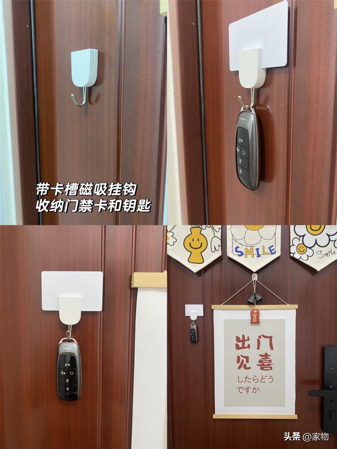 老媽出門經常忘拿門禁卡和鑰匙,爲了提醒自己,就乾脆在門上貼了個磁吸掛鉤,還帶卡槽!