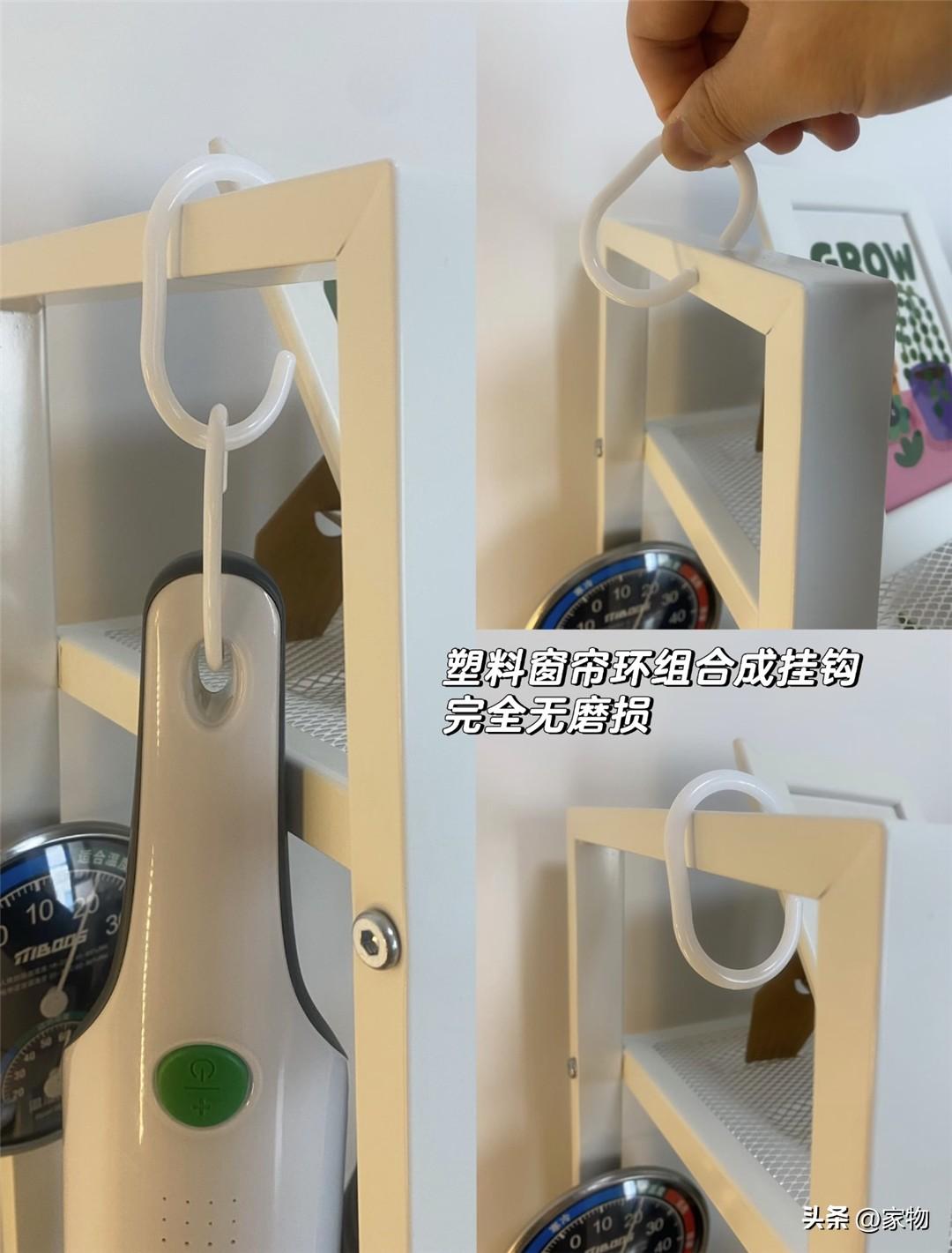 可以略作延展的塑料窗簾環,還可以兩個一組,變成多功能掛鉤,掛什麼掃牀掃把、刮水板、抹布這類的零碎小件,別提多靈活了,基本上只要有個架子,就能當成天然的掛杆,去試試,超好用。
