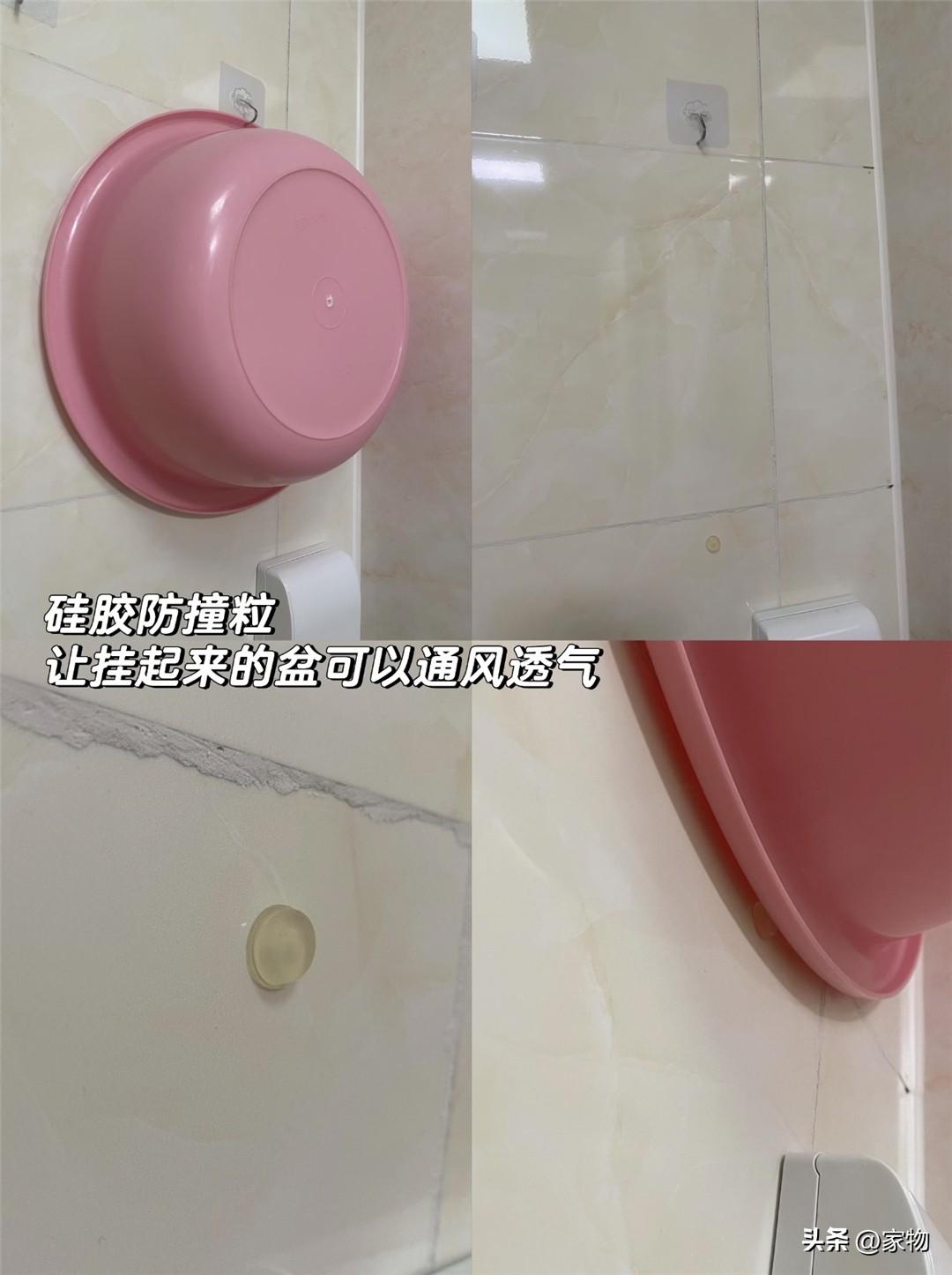 這種硅膠防撞顆粒,最原本是用來貼在什麼鏡櫃旁、衣櫃門邊、門把手後的牆上,避免開關櫃子門扇時磕碰到牆的,但因爲家裏掛的水盆每次都有一股黴潮味道,老媽便將它化作了一個支撐杆,掛盆時剛好能留出一個通風口,真絕了。