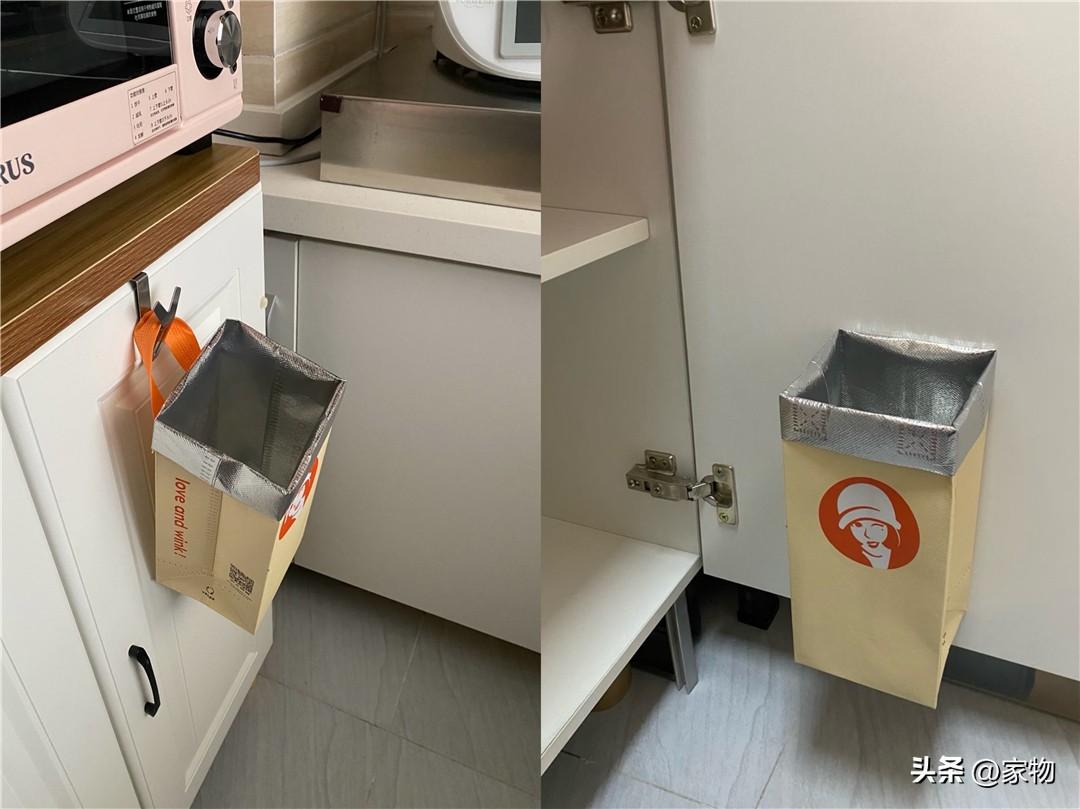 一是留一側提手,當廚房裏的壁掛垃圾桶,親測單杯袋子小一些,雙杯袋剛好;而單杯保溫袋,更適合貼在櫥櫃內側,收納各種垃圾袋,不佔地還整潔。