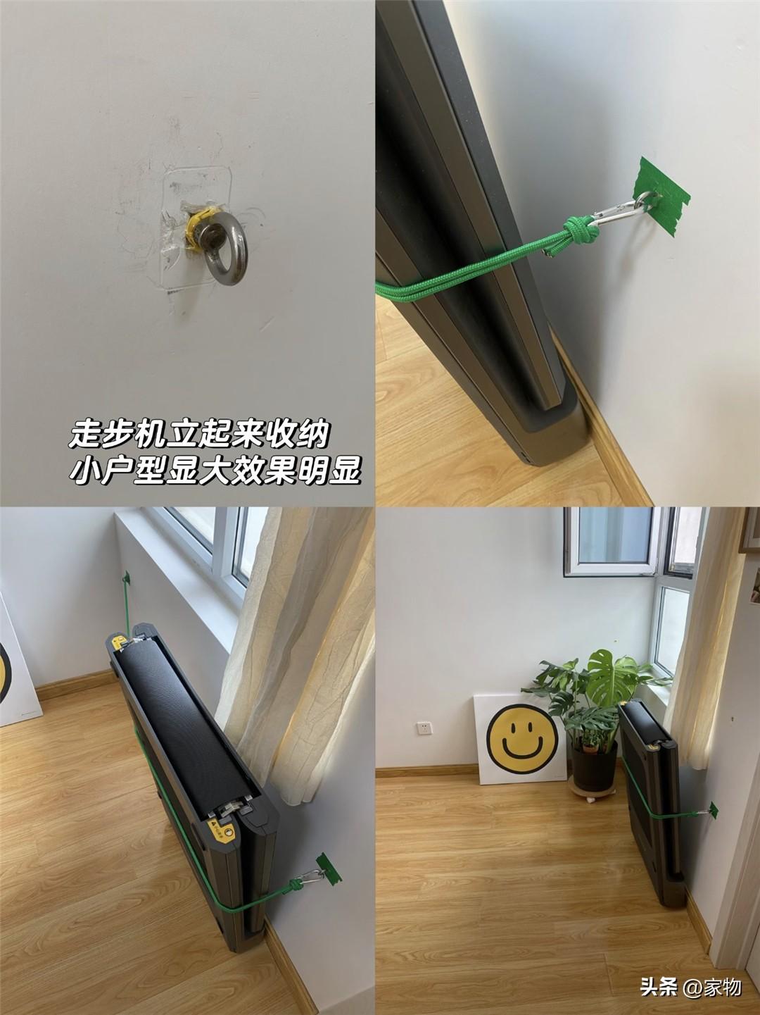 但對於老媽來說,兩個牆面掛環和一根尼龍繩就能解決,用完後把走步機戳起來,繩子往上一套,收納穩穩當當。