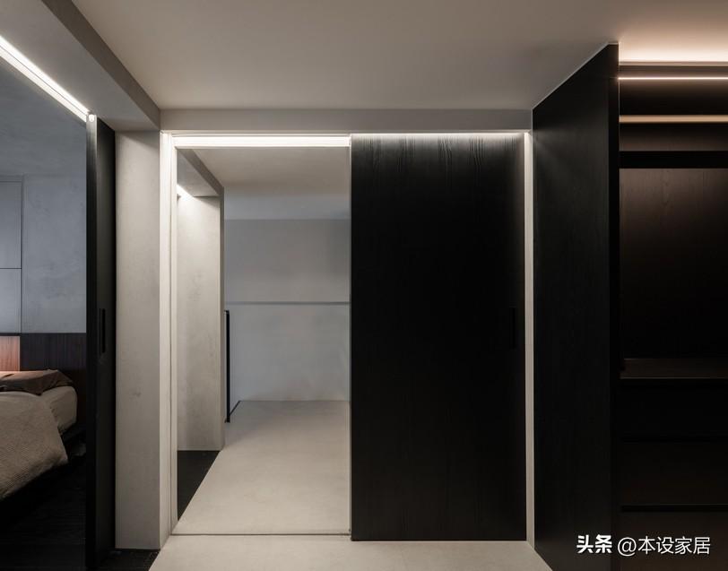 同時,吧檯靠牆側設置Mini bar,櫃門的設計非常巧妙,可以隱藏到櫃體兩側裏面,簡潔又不佔空間,打開內置的led燈帶,高級、美觀,有格調。