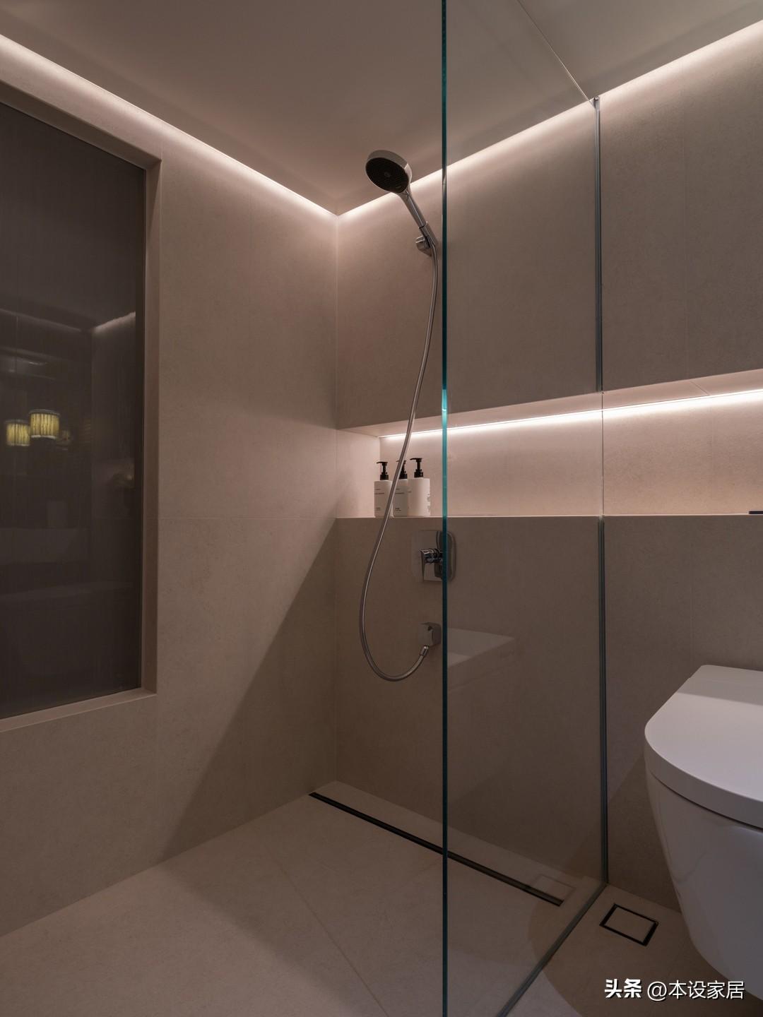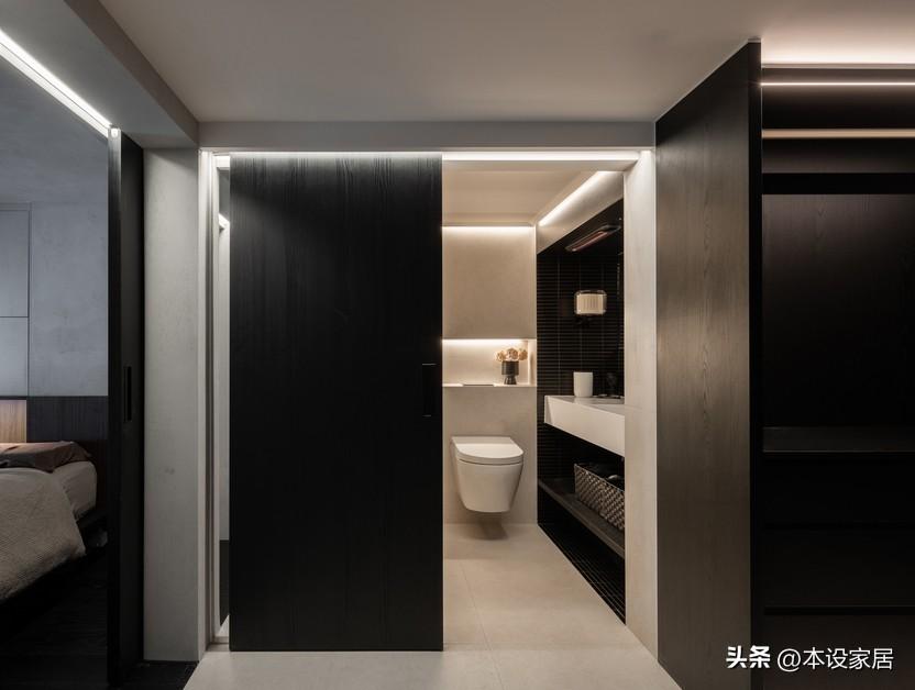 洗漱臺和淋浴房分兩邊,壁掛式馬桶居中,牆地面鋪貼米黃瓷磚,局部黑色磚點綴,在暖光燈的烘托下,顯得精緻又溫馨。