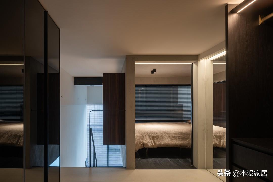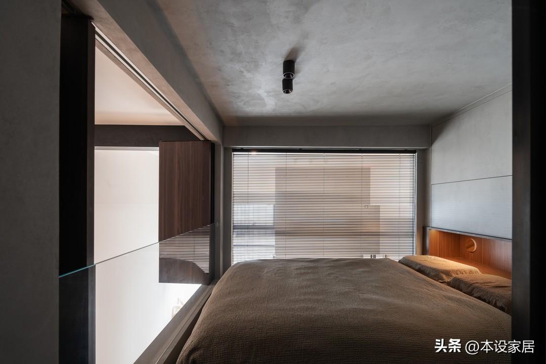 臥室在二層,爲了增加採光和通風,與挑空客廳和樓梯之間的使用玻璃隔牆。