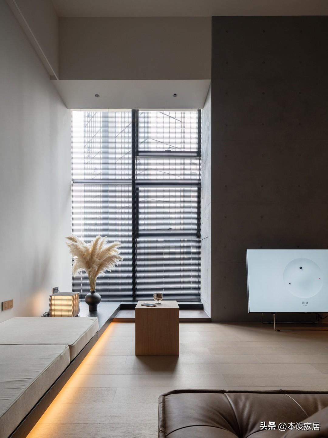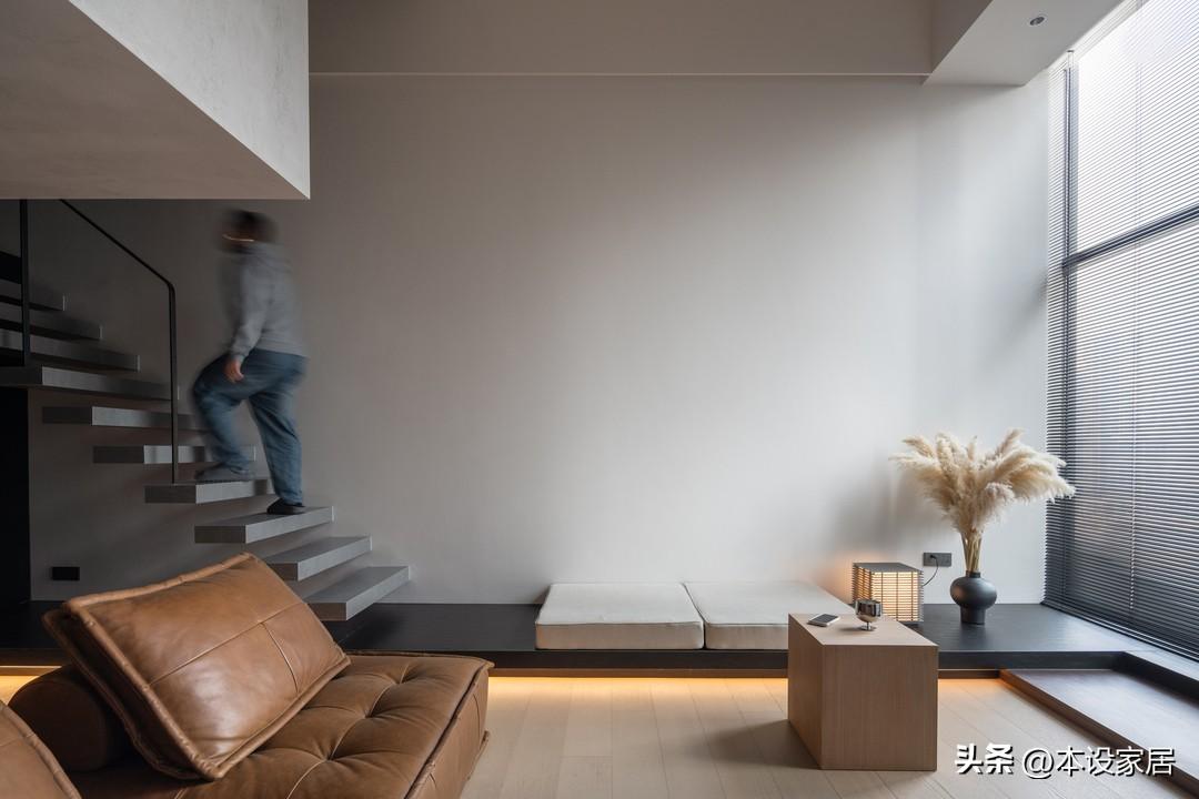 靠落地窗的牆面,打造一個寬度1m的木質地臺,與通往二樓的樓梯相連,可坐可躺,超實用。天氣晴好時,慵懶地坐在軟墊上看書,靜靜感受自然光穿過百葉簾,照進屋內的過程,治癒極了。