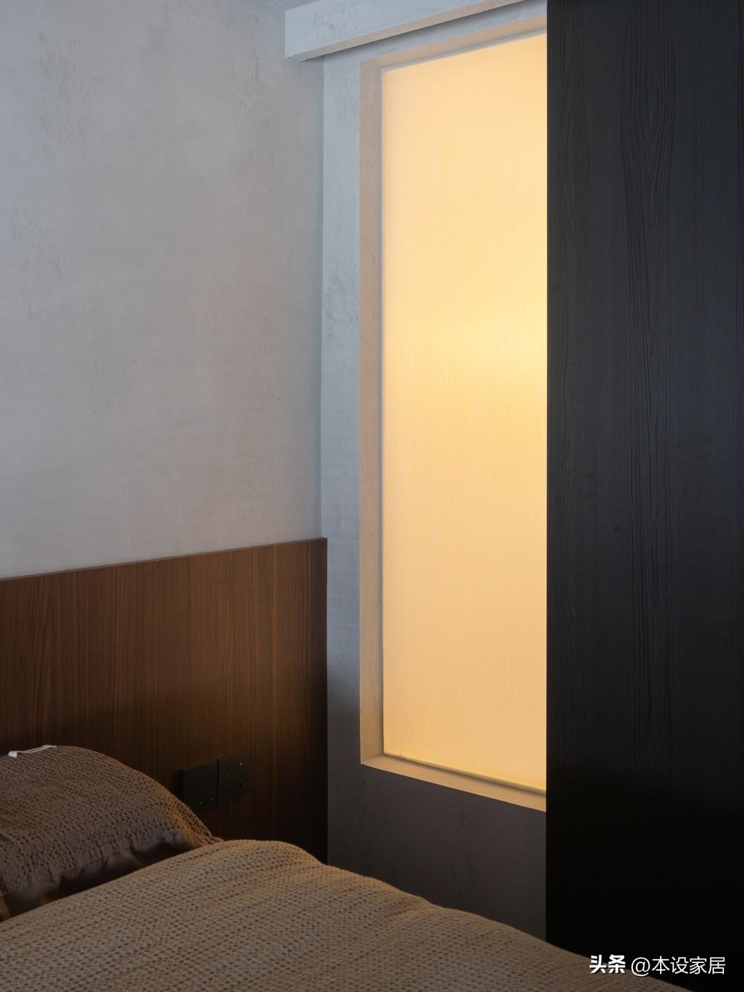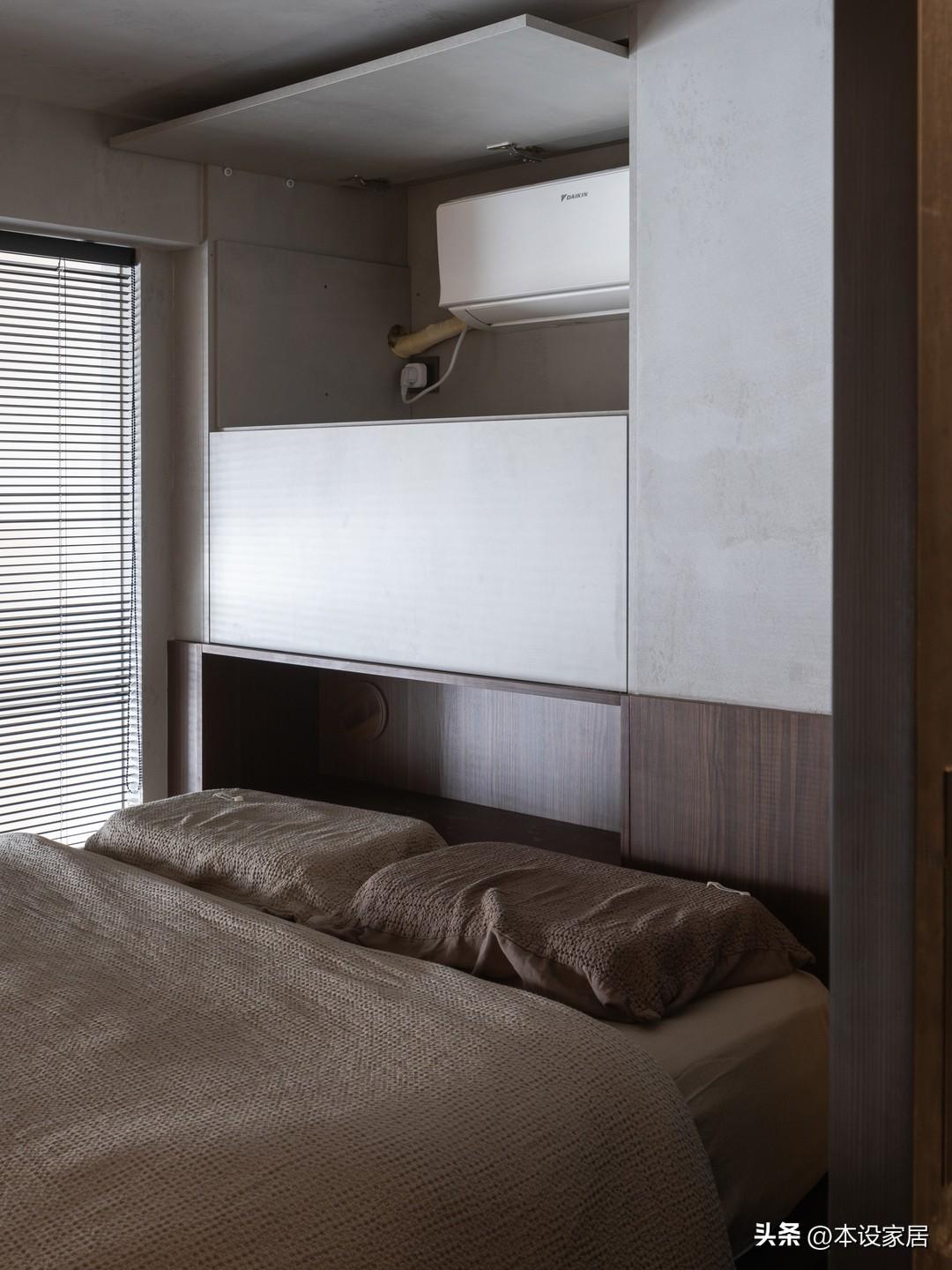由於層高有限,將空調內機藏於牀頭上方的壁櫃內,下方的層板可以遮擋風,避免空調直吹。與衛生間之間的隔牆局部做60公分寬的磨砂玻璃,給衛生間引光的同時,也避免了壓抑感。
