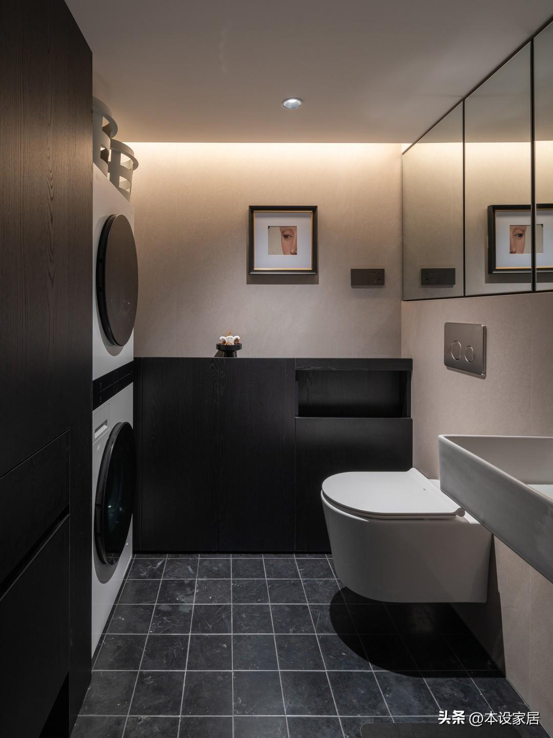 這是一層位於玄關的衛生間,左邊做了到頂的儲物櫃+洗烘機,右邊在壁掛式馬桶的上方做了整排鏡櫃,延伸視覺空間的同時,增加收納空間。