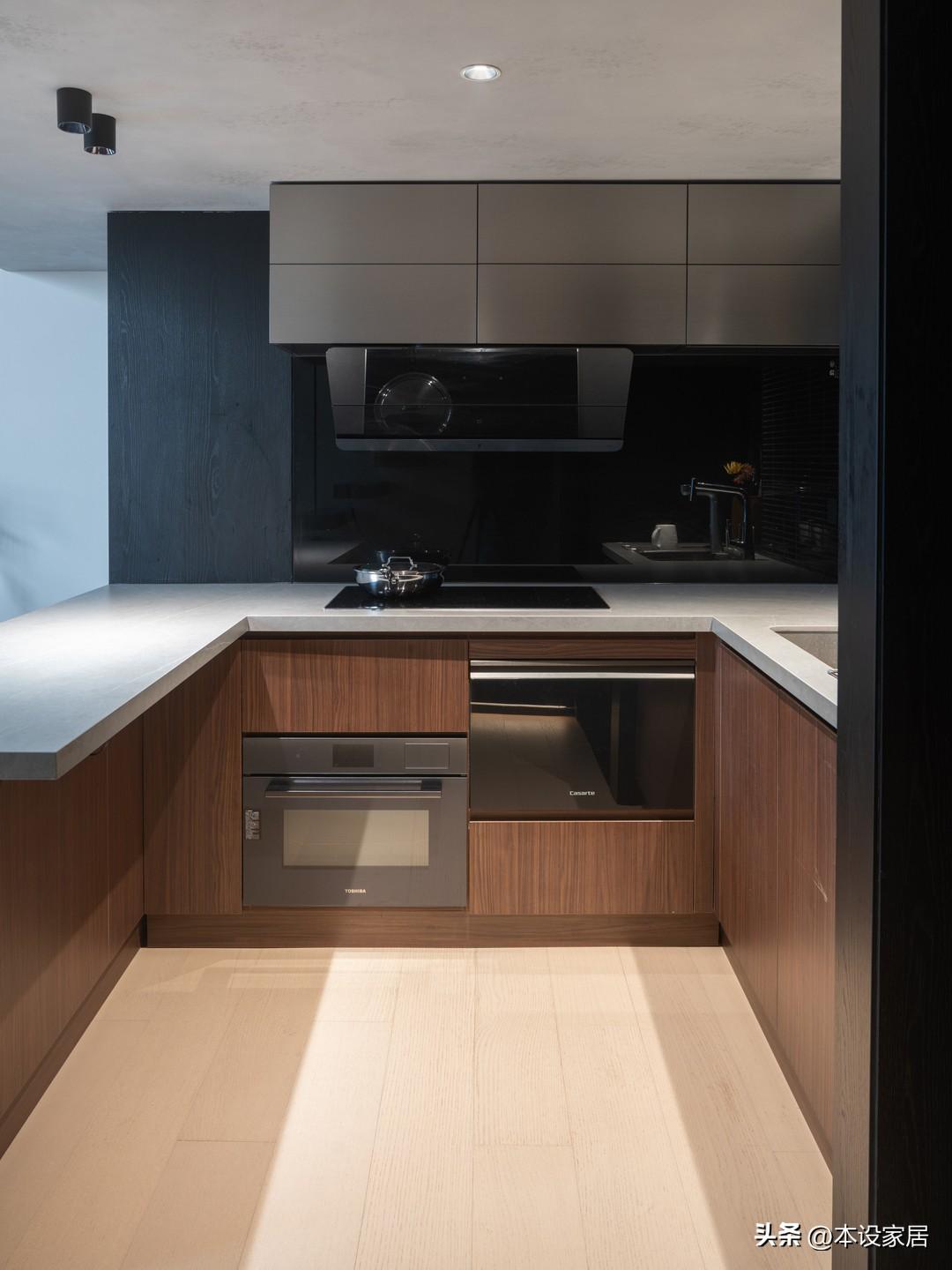 U型的廚房提供更多的操作檯面和儲物空間,烤箱、洗碗機和直飲水等電器嵌入式安裝到地櫃中,看起來整潔有序。