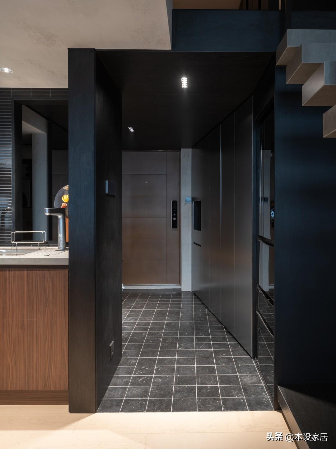 這個區域的地面鋪設深灰色的瓷磚,與牆面共同營造出幽深感,隨着走進客餐廳,先抑後揚,讓人感受到一種曲徑通幽,豁然開朗的視覺體驗。