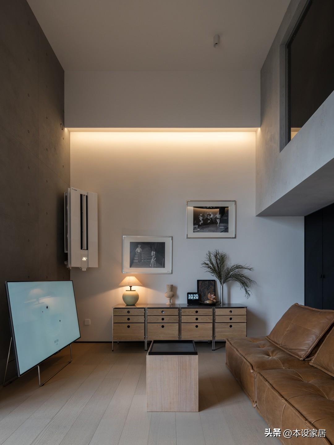 地面滿鋪橡木地板,牆面積刷藝術塗料,局部融入清水混凝土,搭配棕色皮質沙發,不同材質的色彩組合契合自然氛圍,又兼顧了使用的舒適度。