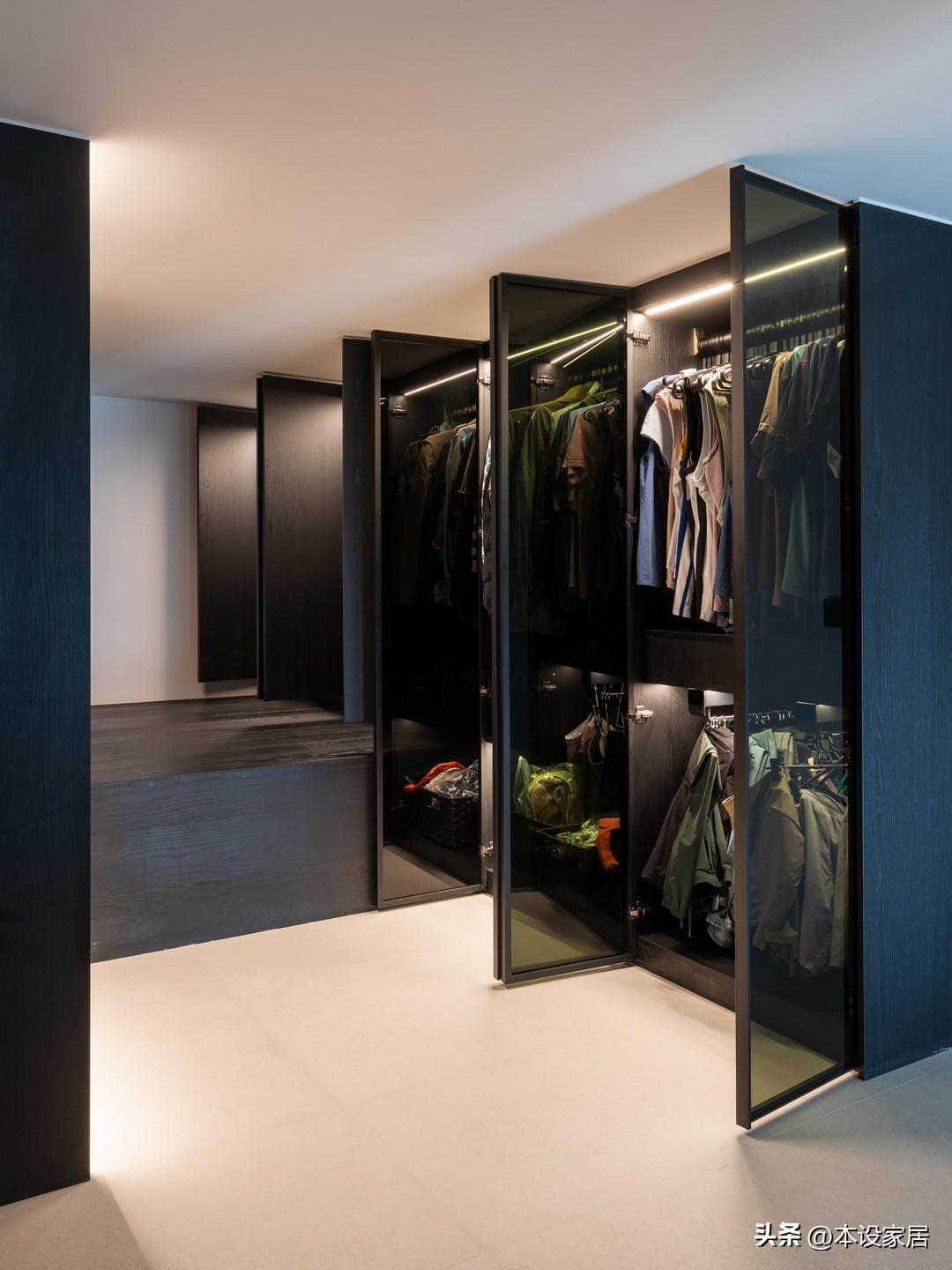 L型的衣帽間提供了超強的收納能力,左邊是開放的次淨衣區,另一側做玻璃櫃門,所有衣物以掛爲主,方便拿取。