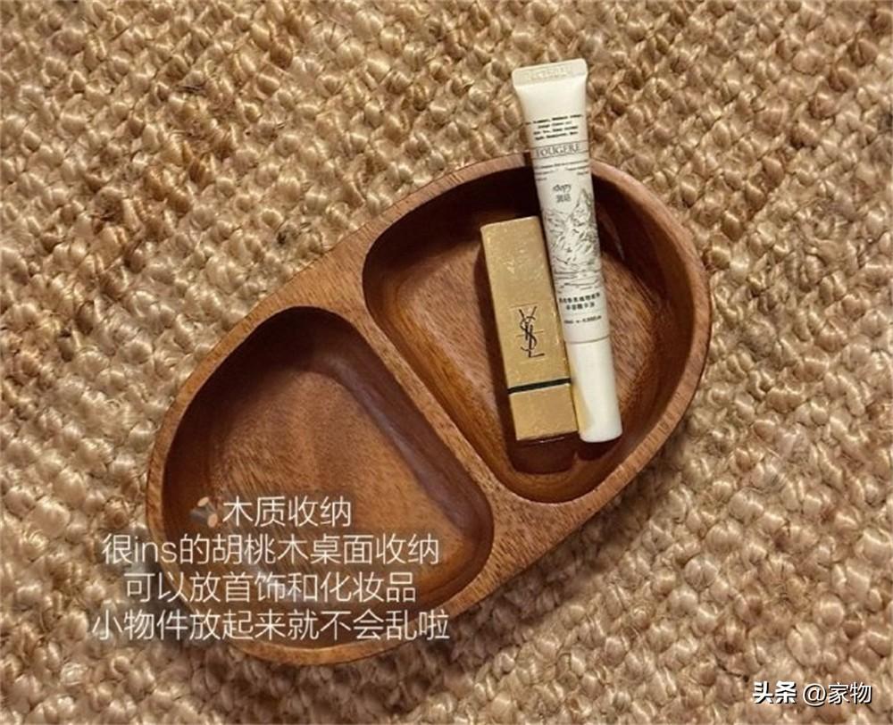 一個超小號的胡桃木收納盤,分爲左右兩側,本來是想拿回家放護手霜和口紅的,後來發現用它收納耳釘戒指這類小件首飾極爲合適,放在梳妝檯上不僅不會佔用太多空間,還相當於是個展示盤,好用的很呢~