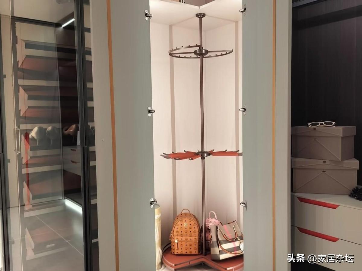 轉角旋轉衣架,是在房間轉角處安裝可以旋轉的衣架系統。例如可以是臥室的轉角,也可以是玄關的轉角,當然也可以是客廳的某個轉角。
