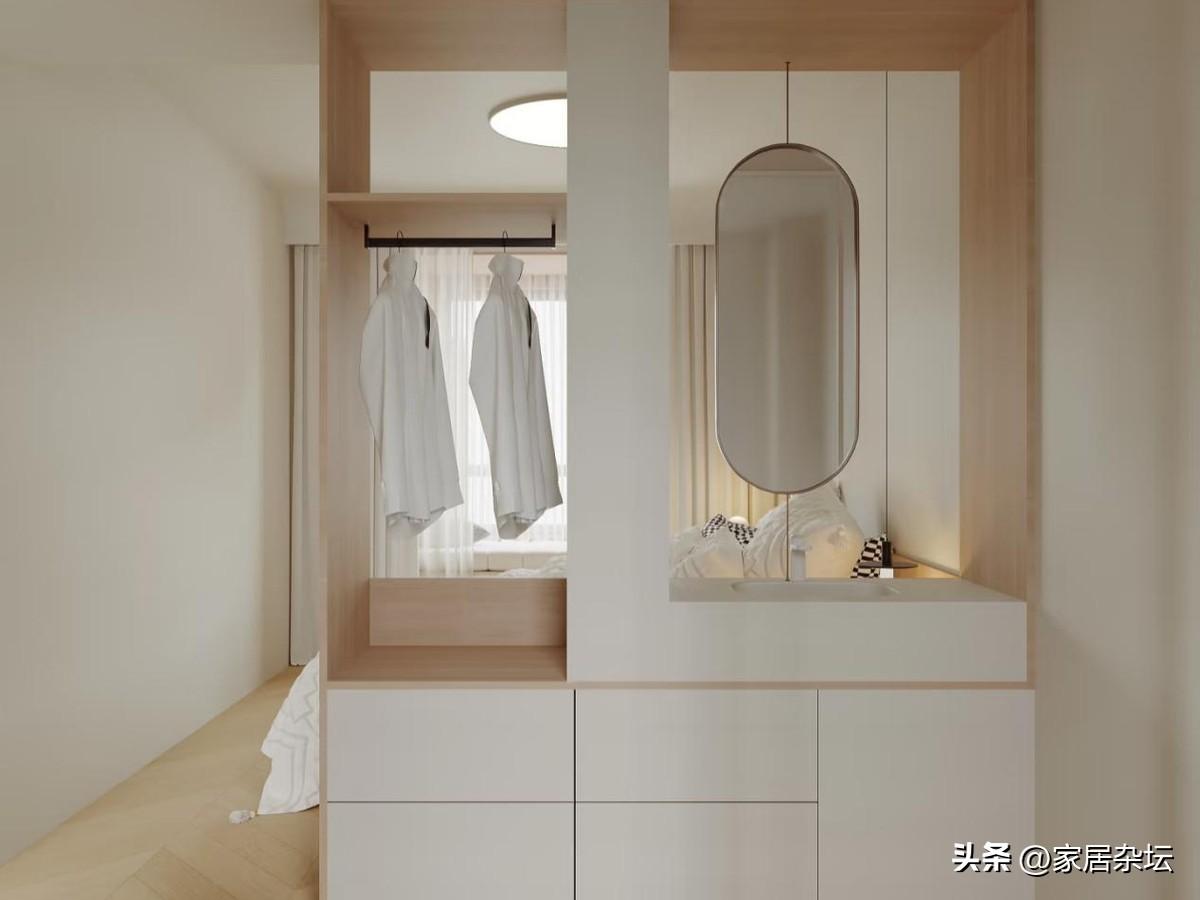 衛生間幹區掛衣區的具體做法,就是在衛生間的幹區,一般是在洗手檯的外側,設計一個寬度60~80釐米的薄型衣櫃。
