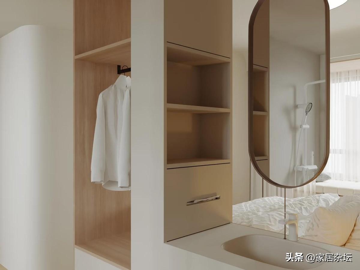 衛生間幹區的掛衣區,一定要做好防潮處理。像在櫃子裏面可以放置竹炭包吸收溼氣,儘量選擇防水性能好的材質。