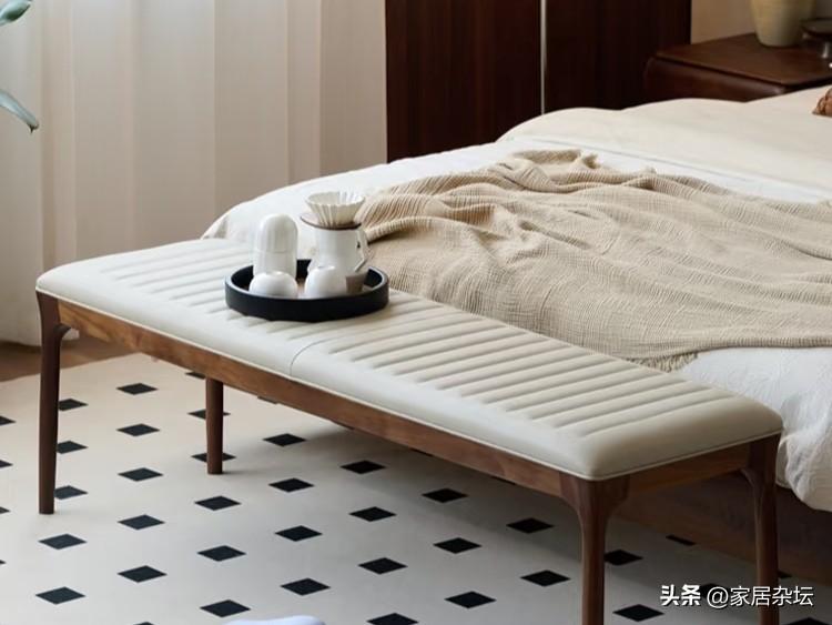 將牀尾長凳擺在牀尾的位置,這個凳子內部是儲物空間,而頂部一般有透氣孔,或者採用柵欄式的設計。