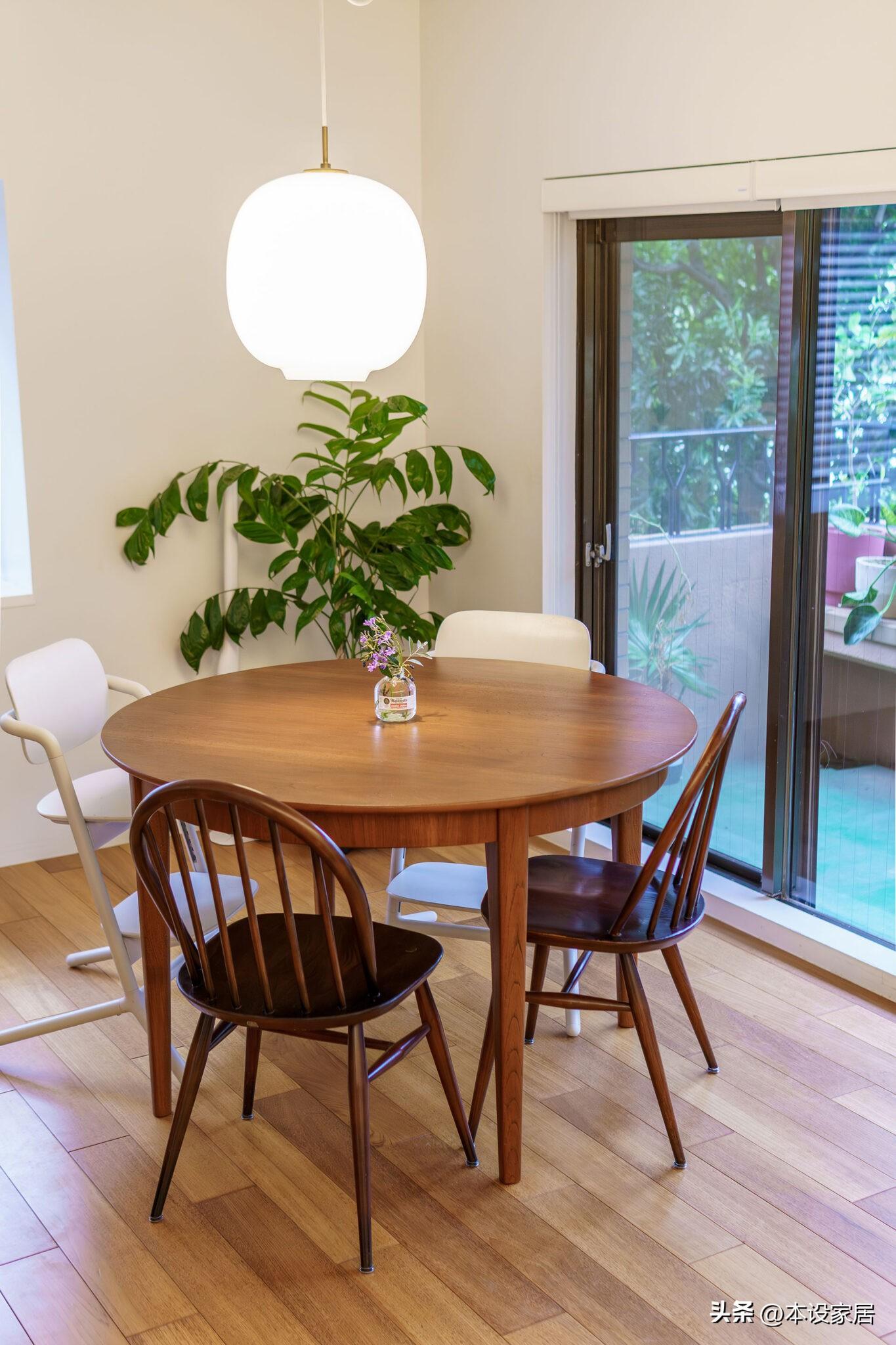 餐廳在客廳的另一邊,佈置一張櫻桃木圓桌和不同款式的餐椅,不得不說,大白牆和實木傢俱搭配的相得益彰,而綠植和燈具,又賦予了空間更深層的層次感。