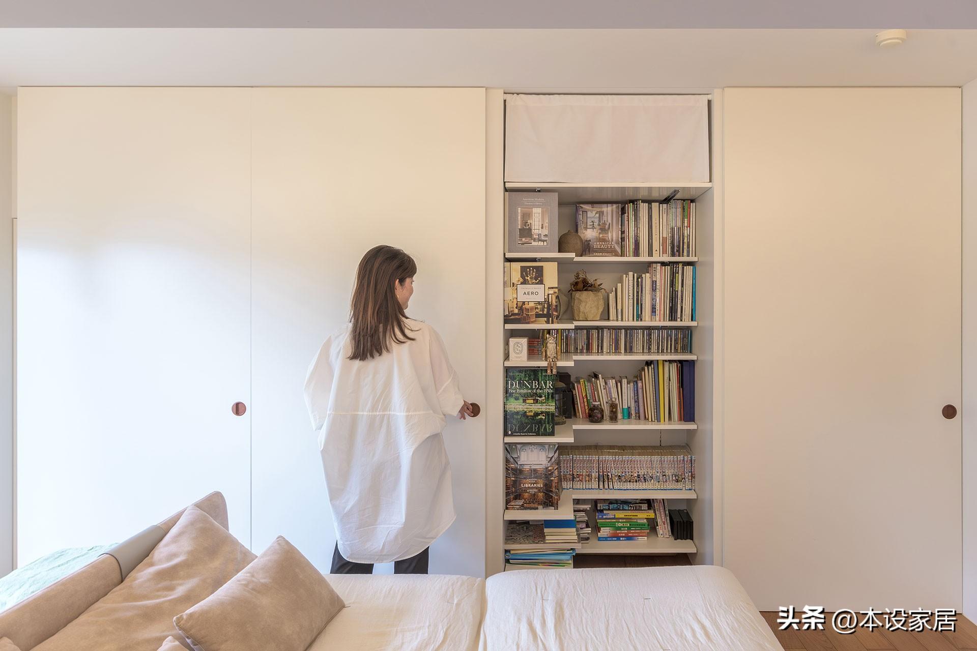 同時,Sumika非常清楚,有倆娃的家庭需要充足的儲物空間,所以靠牆定製了四組儲物櫃,將空調、書籍和生活用品有序納入其中,關上白色的櫃門,客廳真正做到無雜物,是一個讓人放鬆身心的理想場所。