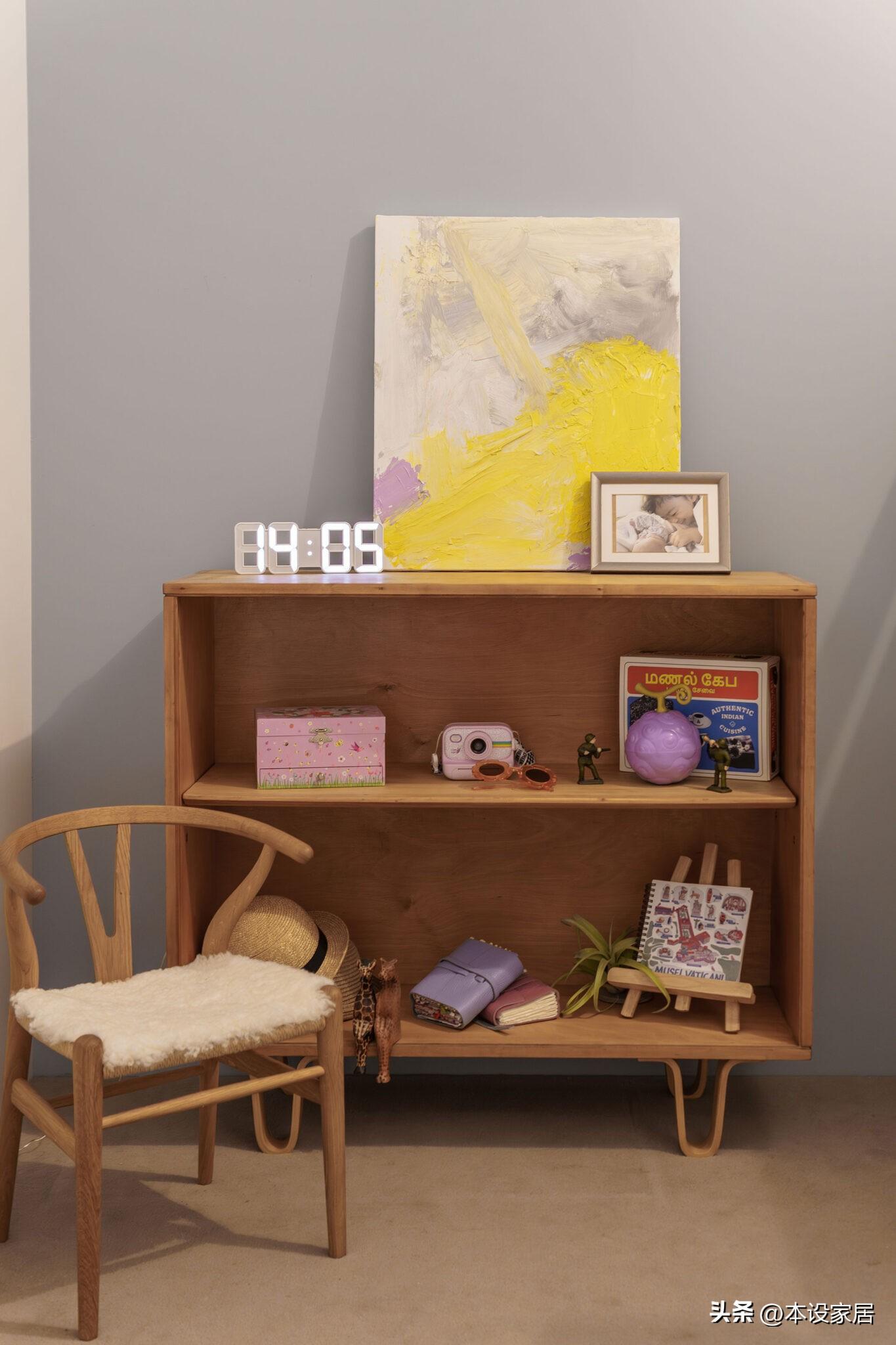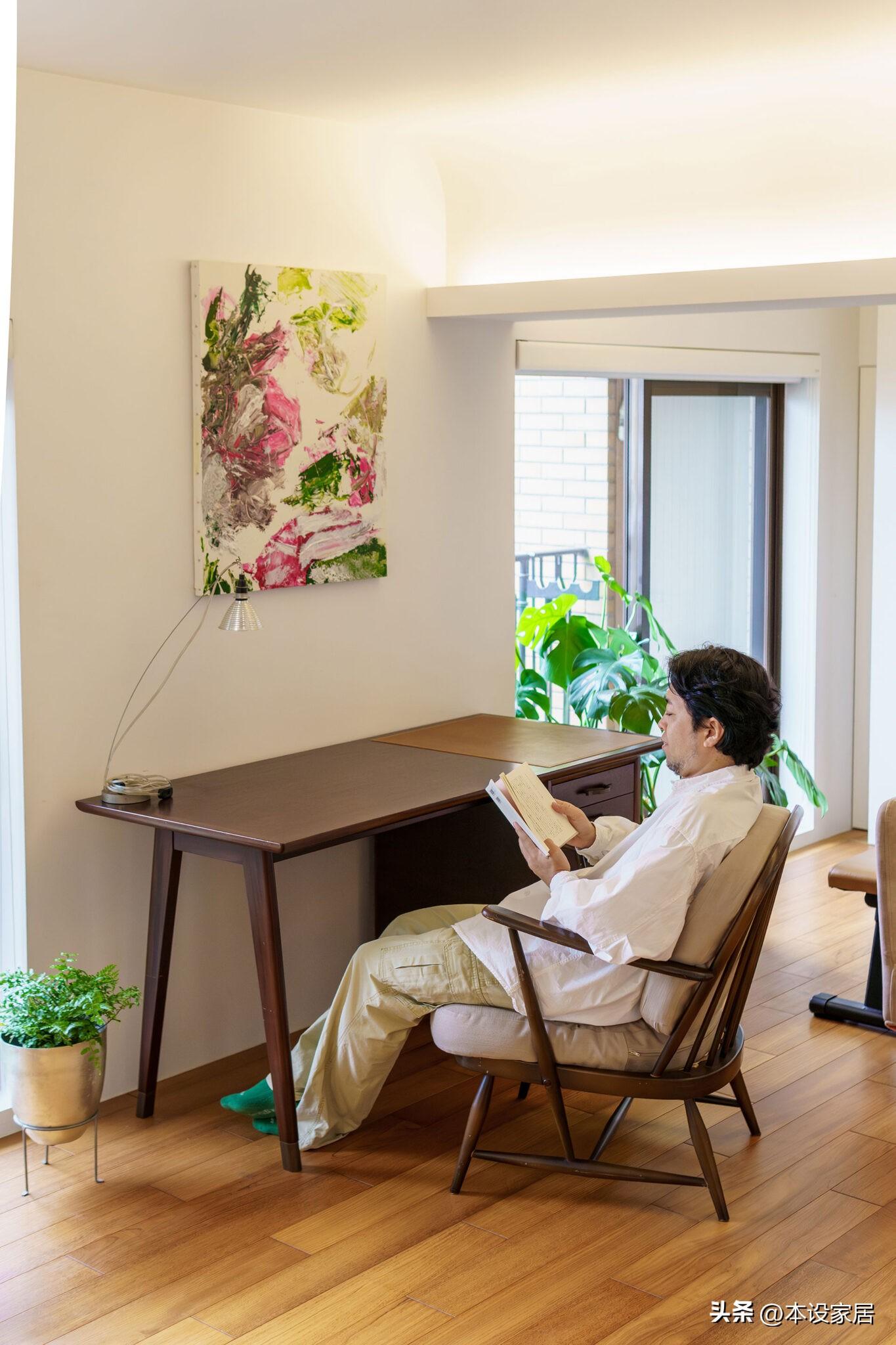 此外,客廳和餐廳之間還擺放一組書桌椅,與溫潤地板交織出自然的底色,牆上的一幅抽象畫以斑斕色彩點綴素淨牆面,而一旁的綠植在悄然生長,獨自在這裏看書、喝咖啡,都能享受到舒適愜意的時光,太治癒了。