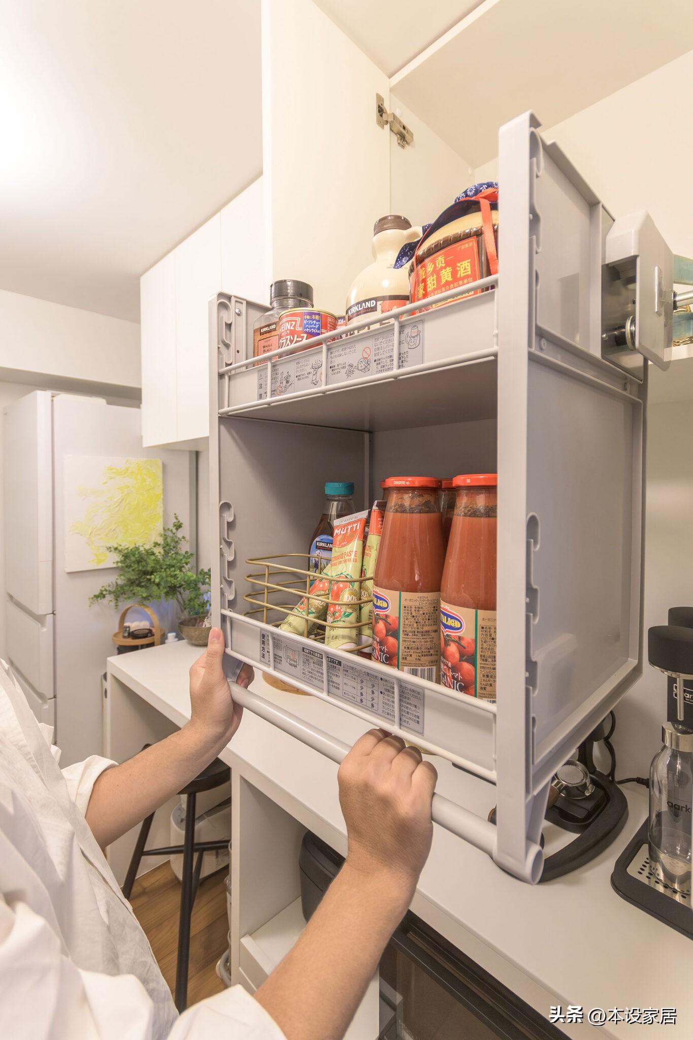 爲了統一視覺效果,半開放式的廚房配置了白色的冰箱和抽油煙機,和白色的櫥櫃完美的融合,形成一個乾淨整潔的區域,將調味瓶放置在可下拉的拉籃裏,拿取超輕鬆。