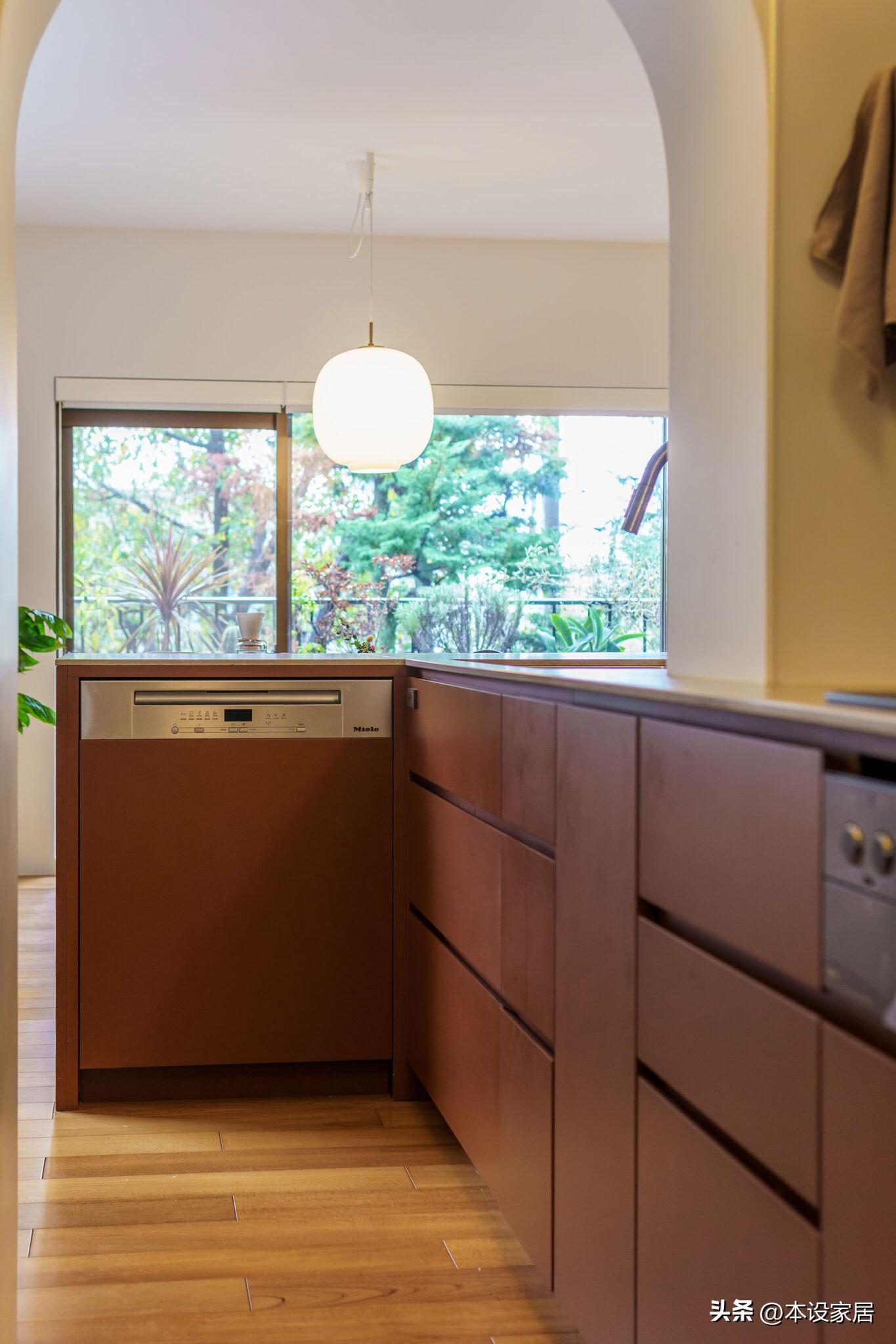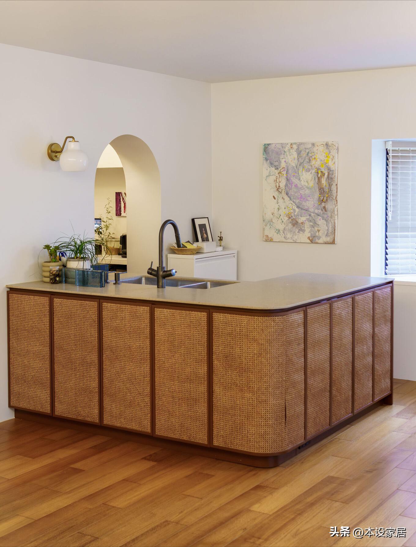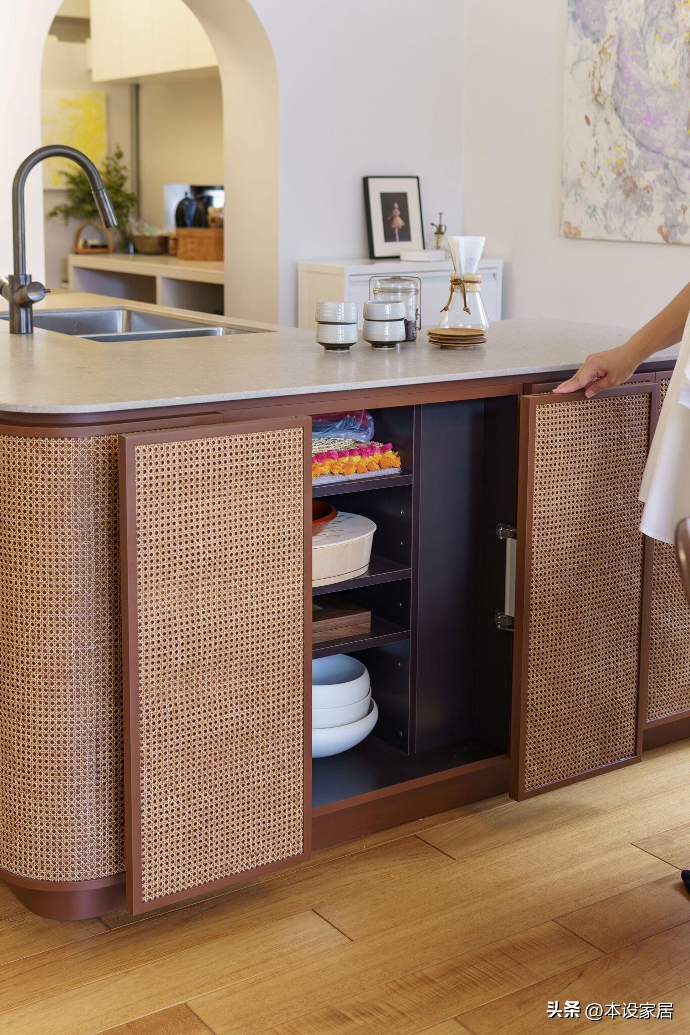 L型的備餐檯功能強大,提供更多的儲物空間和更大的操作平臺,選用實木+藤編的自然材質,看起來相當的治癒。