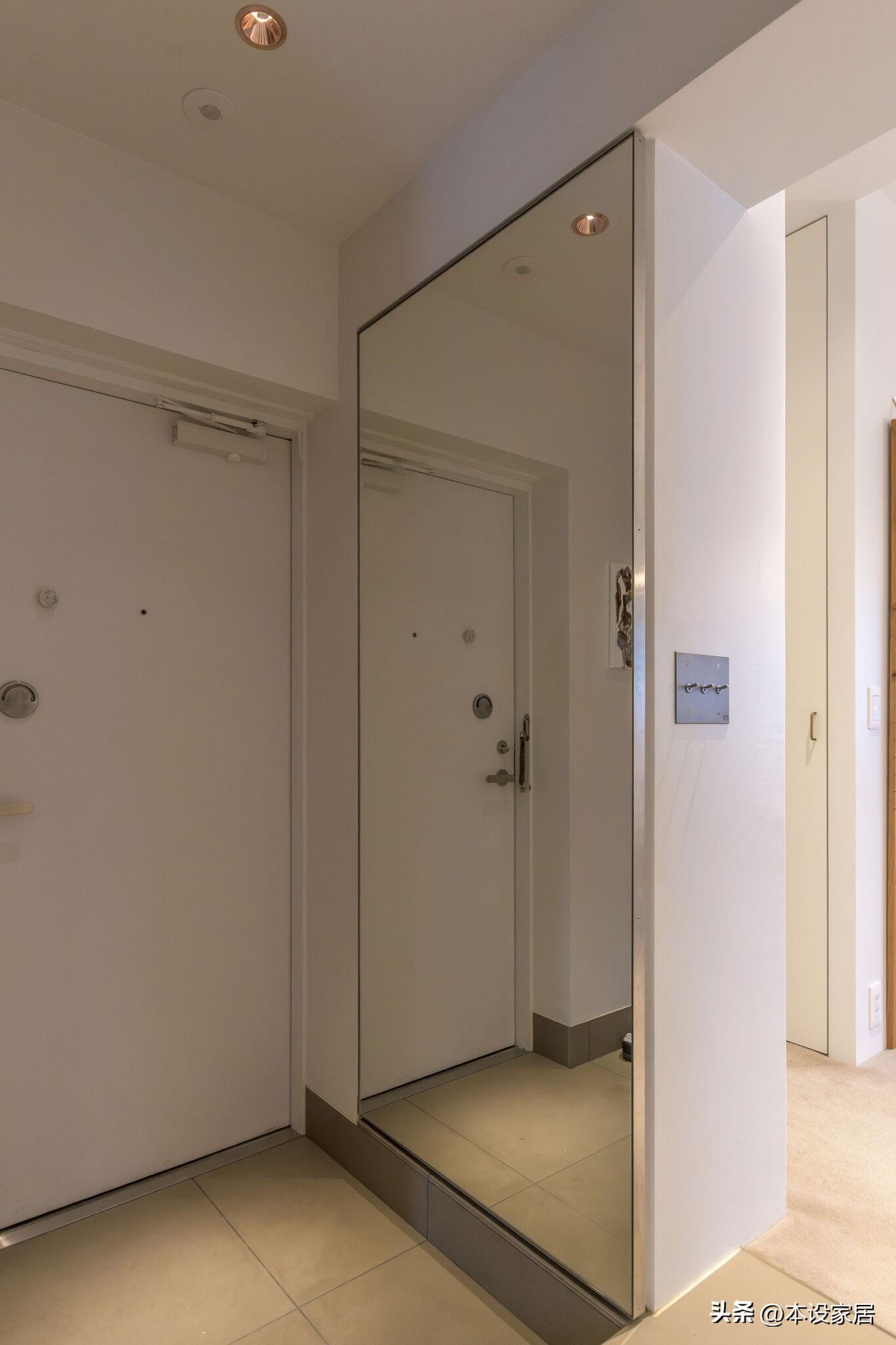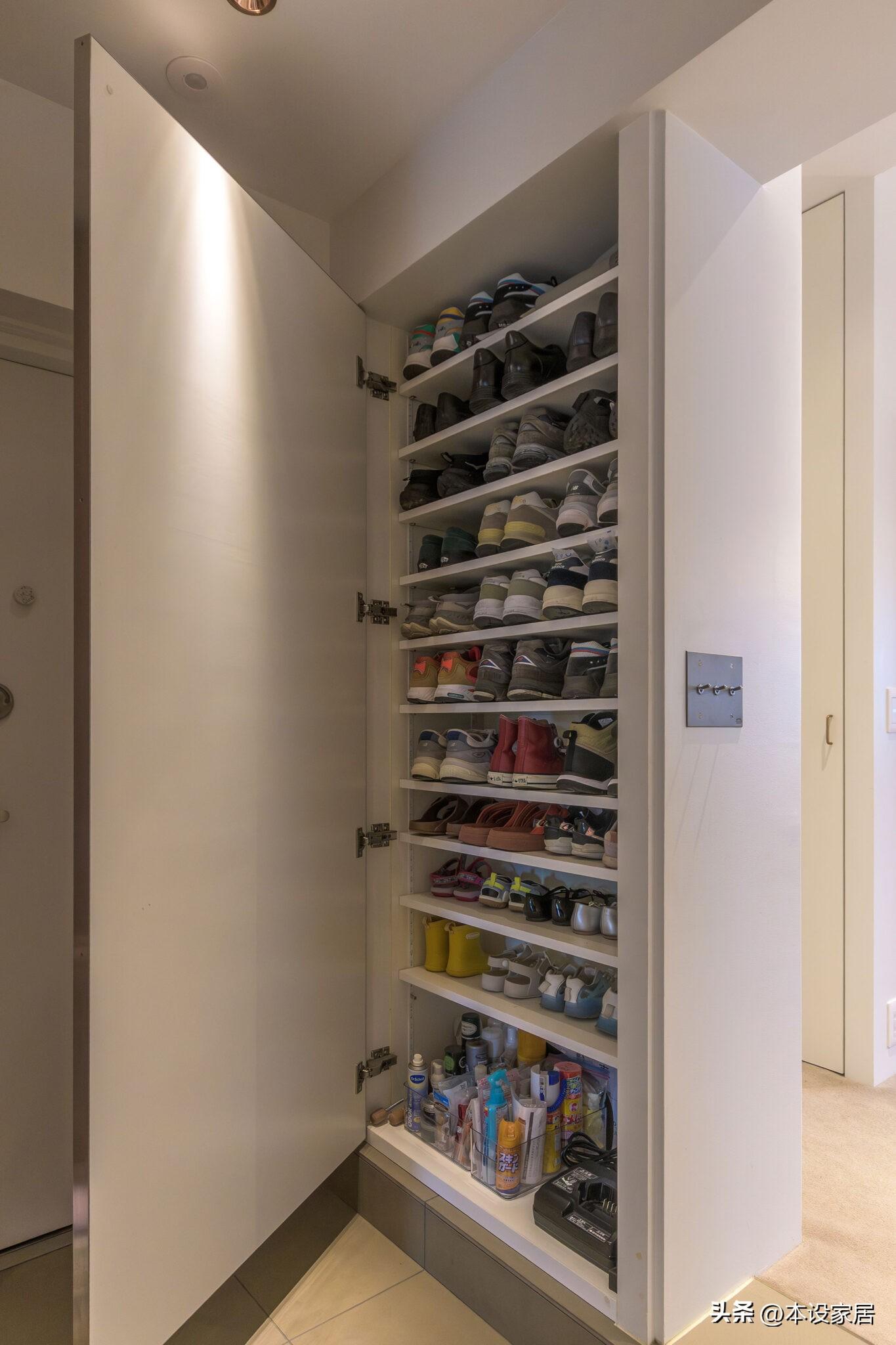 在入戶門的右邊,乍看以爲只是面鏡子,打開後卻另有玄機,裏面隱藏着一個垂直的多層鞋櫃,小孩和大人的鞋子自下而上擺放,整整齊齊,拿取方便。