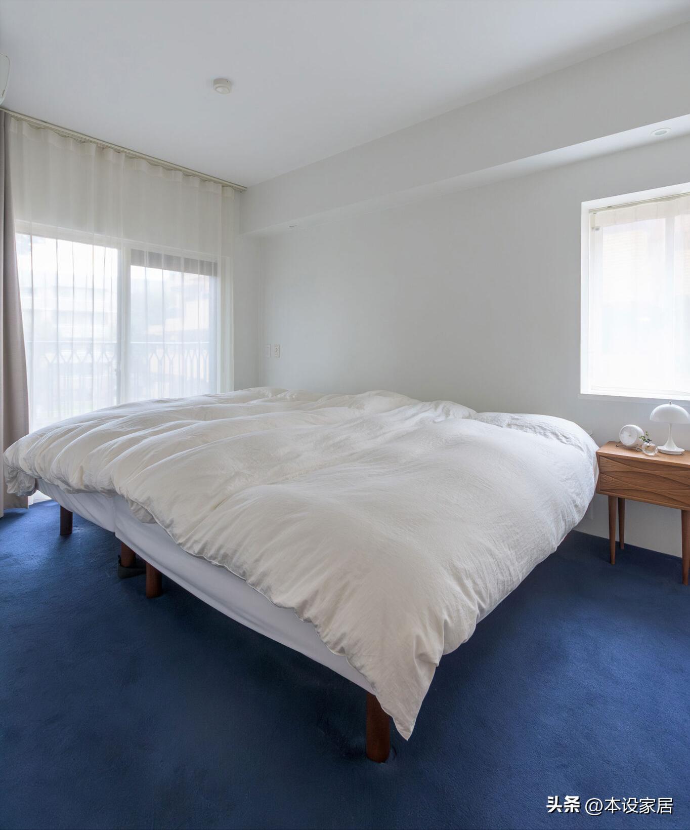 主臥簡潔明瞭,地面鋪設藍色地毯,牆面和天花刷白色漆,除了靠牆安裝衣櫃外,就是佈置兩張1.2米單人牀,沒有其他多餘的物品,甚至連門都沒有。