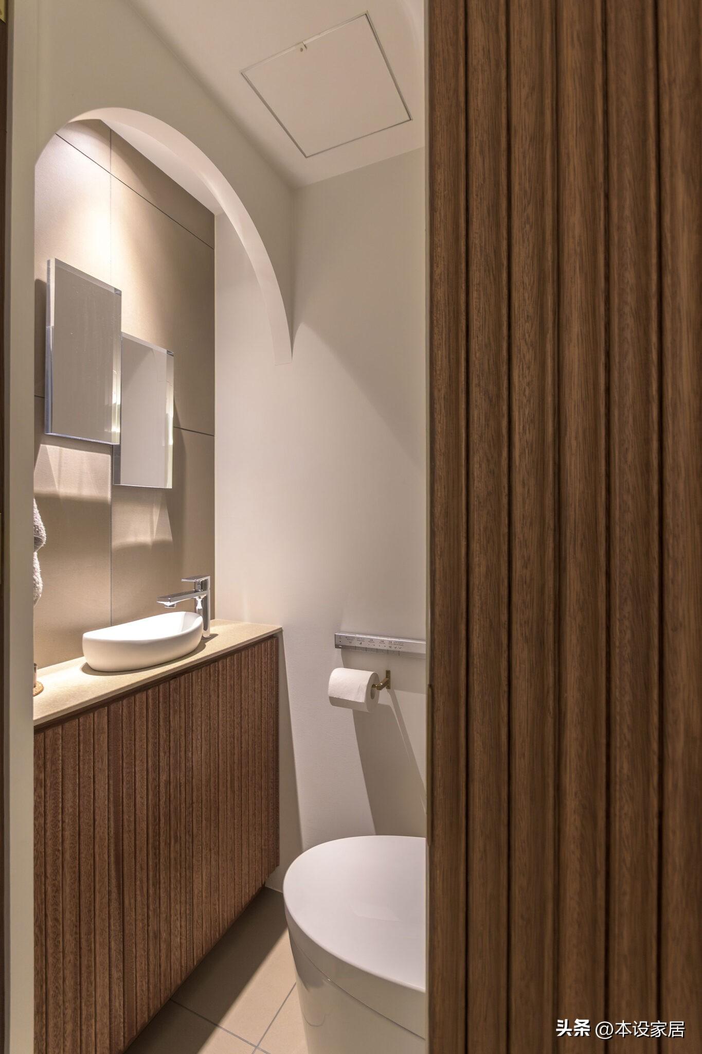 衛生間採用四分離,洗漱臺、馬桶間、淋浴房和洗衣間各自獨立,特別是對於居住人口較多的家庭,互不打擾,可以提高使用效率,白色調也顯得更加乾淨整潔。