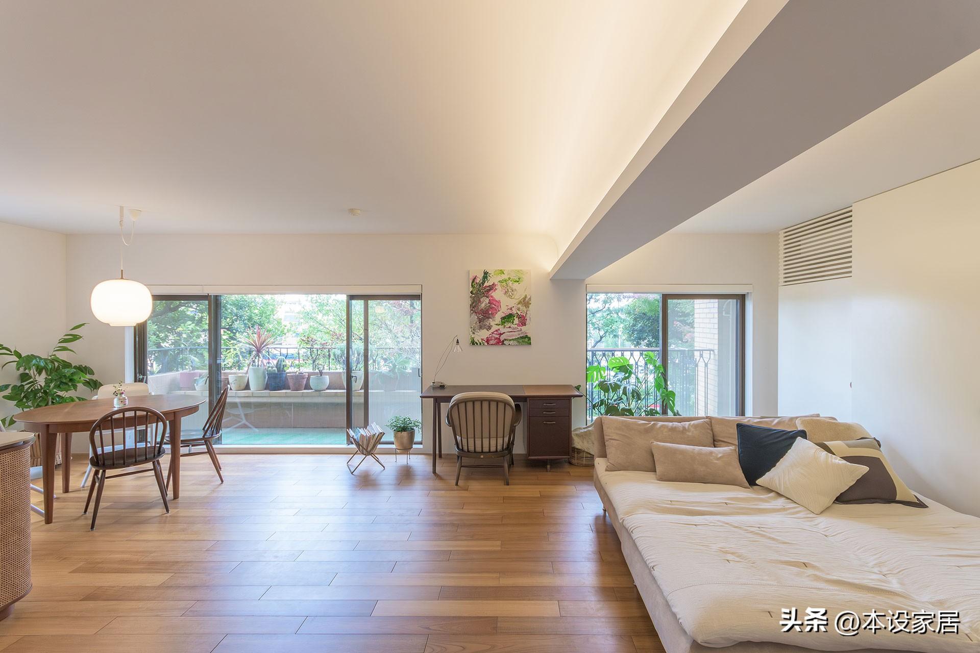 他們秉承着越簡單越快樂的原則,沙發、餐桌、書桌等功能區佈局合理,沒有茶几,既滿足了日常生活的需要,又保持了空間的開闊感,光從一塵不染的地板,就可以看出女主人的勤快,以及一家人的共同遵守。