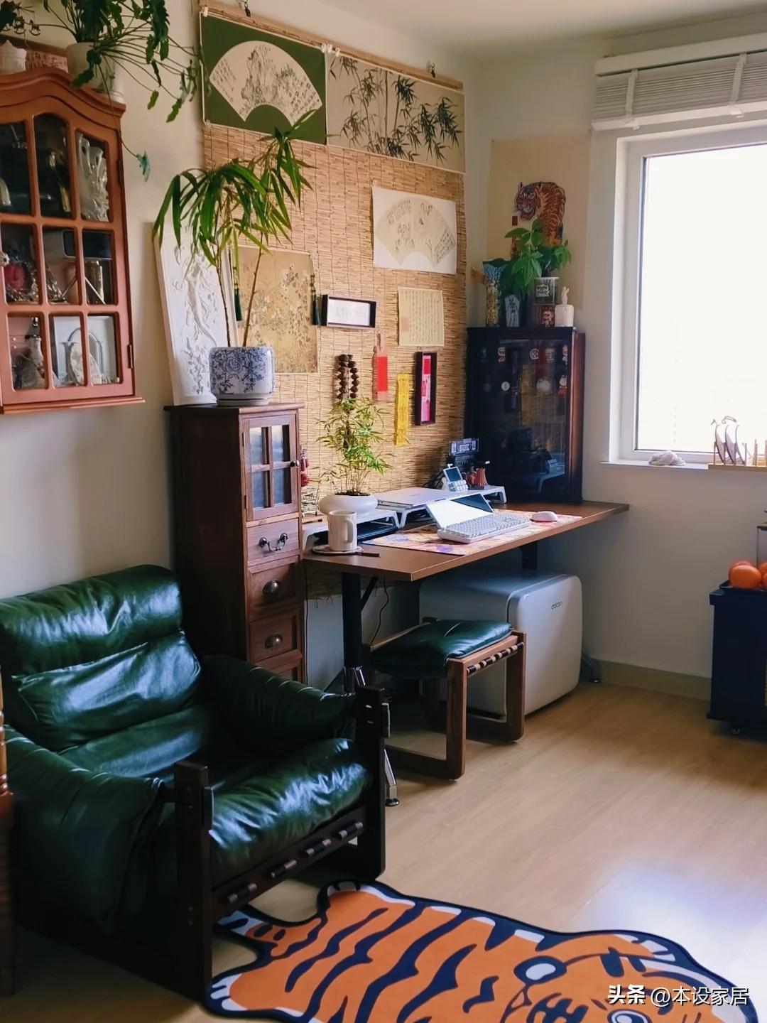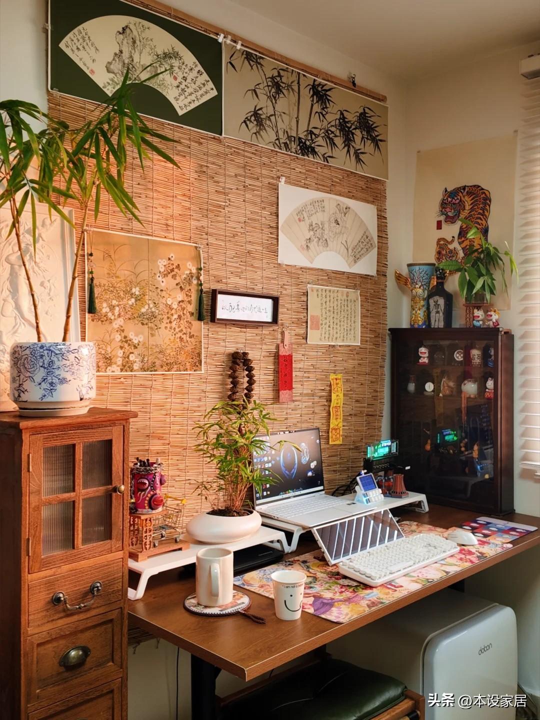最外面的是小哥工作區,加入草編、竹子、國畫、書法等元素,很中式,但卻毫無違和感,不得不說,小哥的審美真不錯。