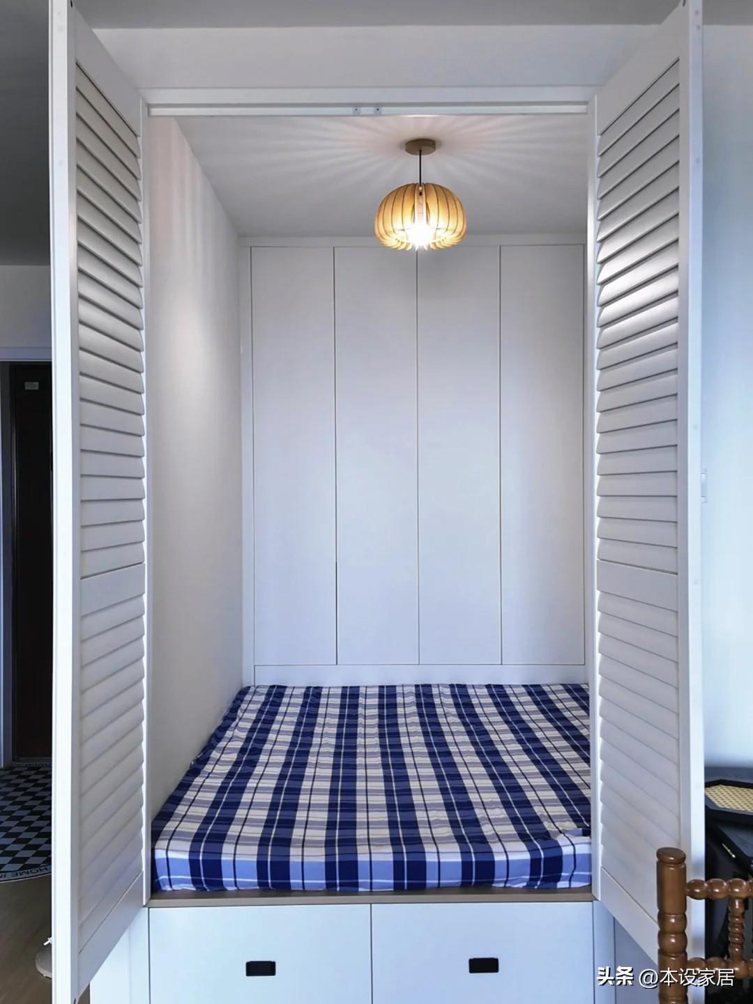 整體的白色調不顯逼仄,搭配藍色牀品,在南瓜燈的暖光渲染下,自然、溫馨又舒適。