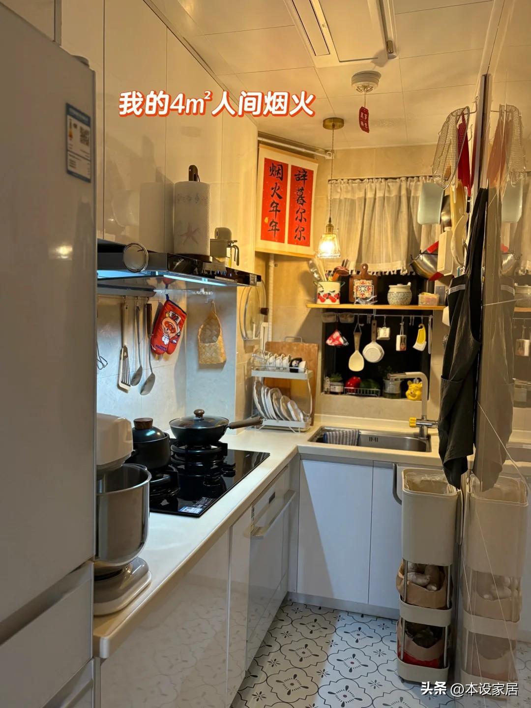 廚房面積約4㎡,可以用“麻雀雖小,五臟俱全”來形容,白色牆地磚,搭配白色冰箱和櫥櫃,還特意預留小推車和垃圾桶的位置,再加上滿滿登登的生活用品,給人一種煙火氣十足的感覺。