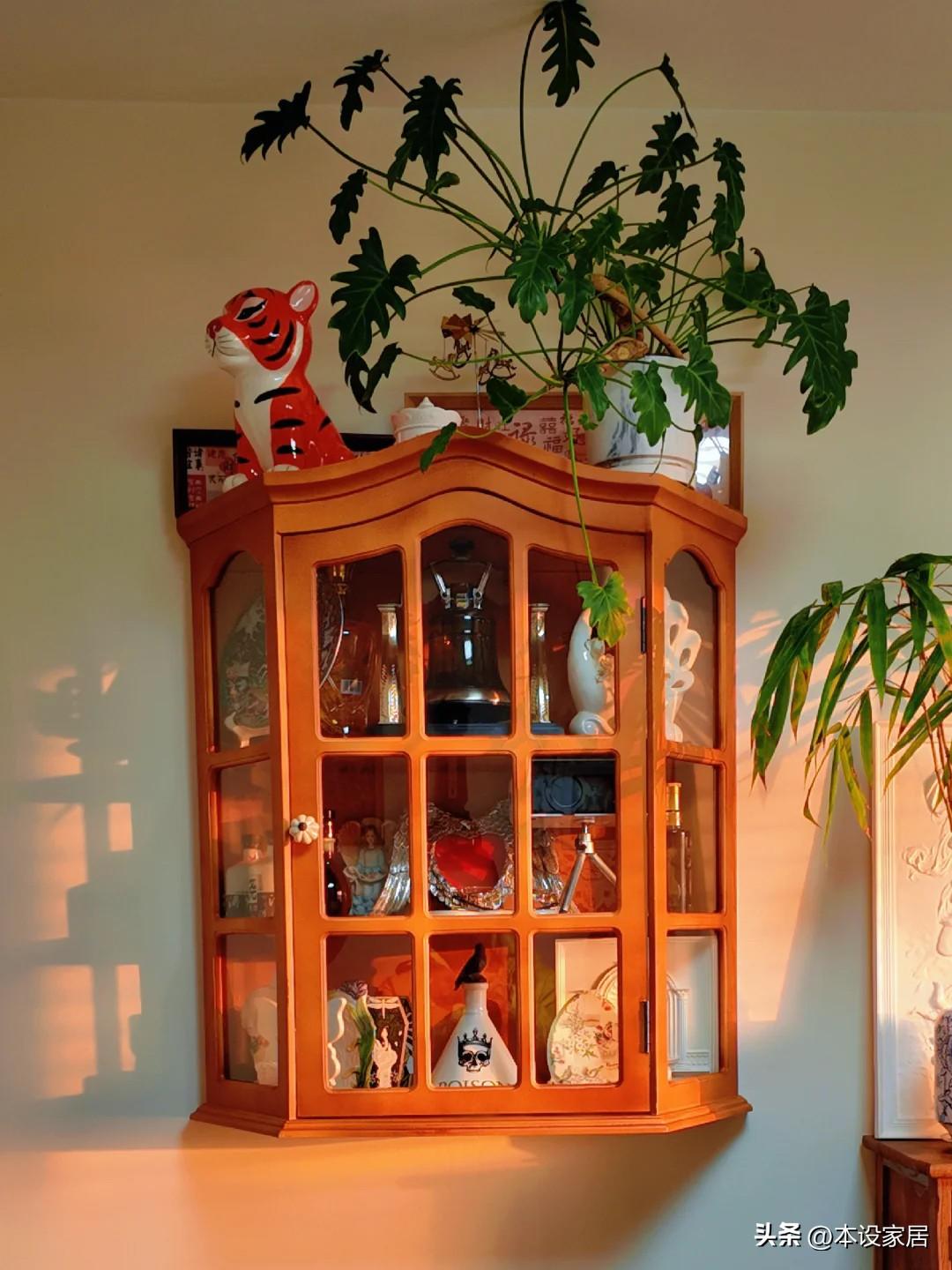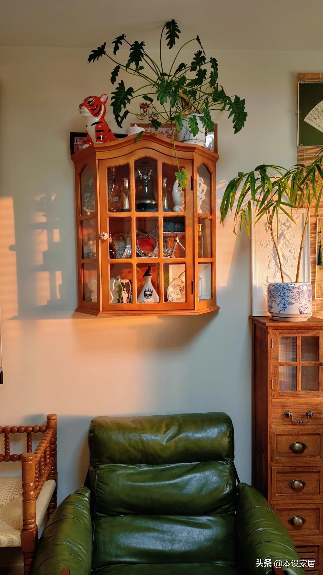 相鄰的是橄欖綠真皮沙發,上方是帶玻璃的胡桃木色壁櫥,擺放日常收集的奇奇怪怪的裝飾品,能隨時觀看,還防塵。