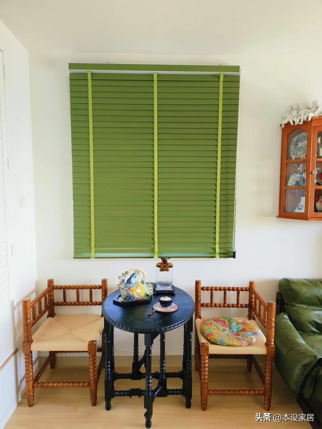 靠臥室的位置剛好有個小窗,小哥佈置一組法式復古的Bobbin柚木轉角椅,搭配同系列的黑色圓桌,而實木手感溫潤,經久耐用,搭配“X”型編制的草繩坐面,透氣性好,與抹茶綠的百葉窗簾搭配的相得益彰。