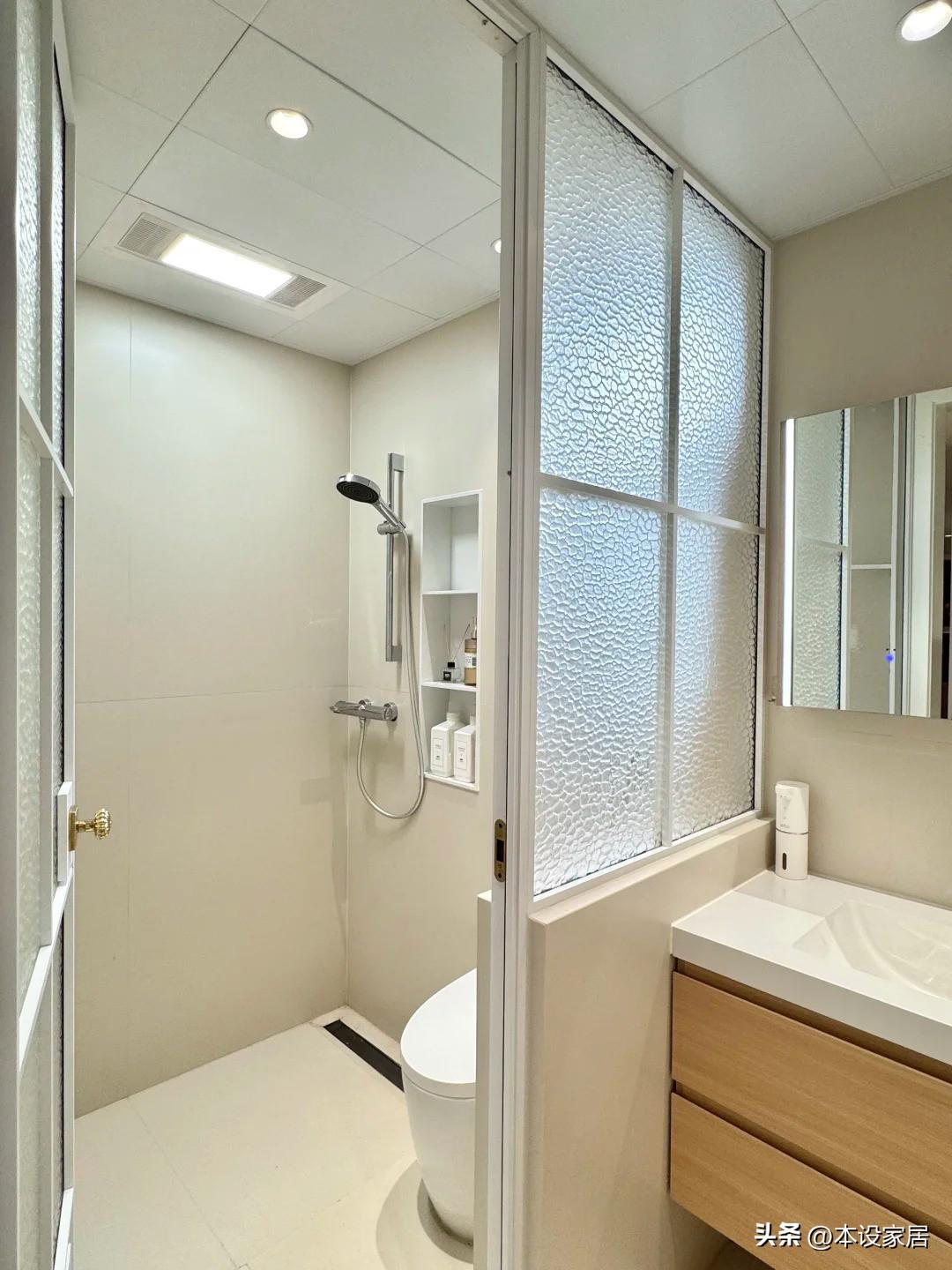 考慮到暗衛,所以選用淺色系材質,牆地面鋪貼米白色瓷磚,原木色臺盆櫃、鏡面櫃和淋浴房的壁龕都可以收納洗浴用品,非常實用。