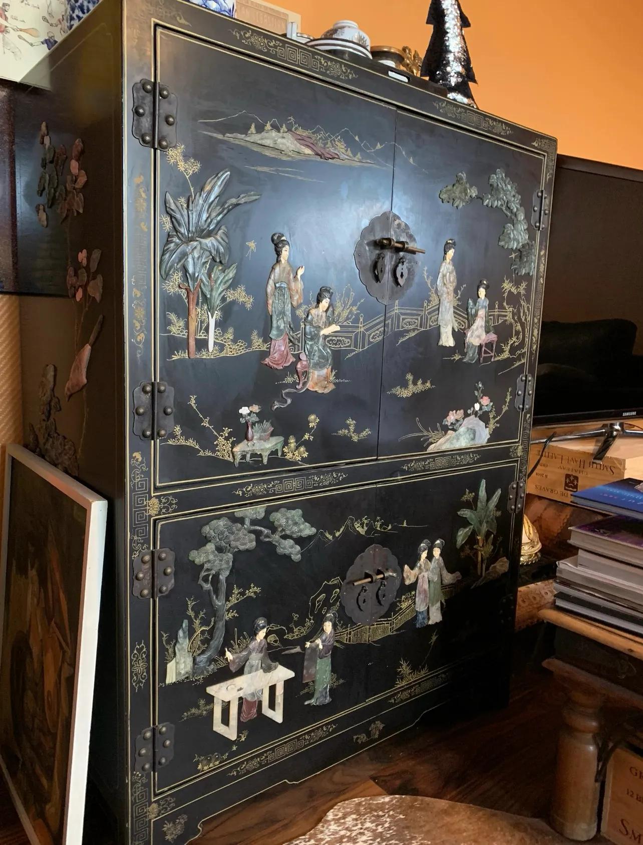 因爲據我搜集的信息,這應該是1850年前後的一件典型的中式百寶嵌大漆立櫃,黑漆爲底然後鑲嵌螺鈿、玉石、瑪瑙……材料,繪製成題材畫。