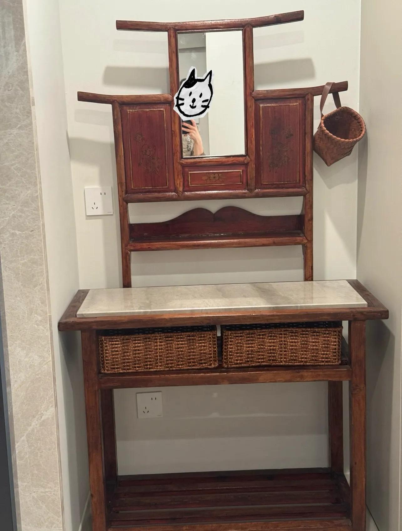 之後,通過清洗、打磨、上色,最後再加了兩個收納籃,買了一塊大理石,將之改造成了一個功能完備的梳妝檯。鏡子、檯面、收納空間,一樣不缺。
