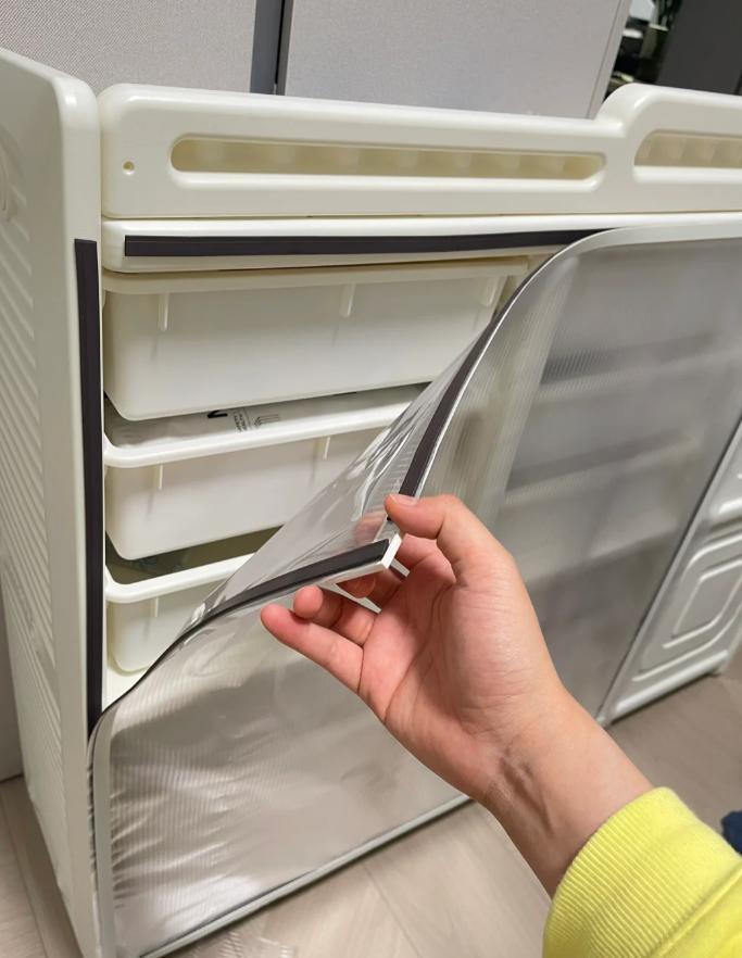 這玩意說白了就是在透明PVC塑料的四周加了磁吸貼,根據自家開放式櫃子的尺寸,把磁吸條粘貼上就可以了,這樣PVC就可以完美吸附住了。(拿取也比較方便)