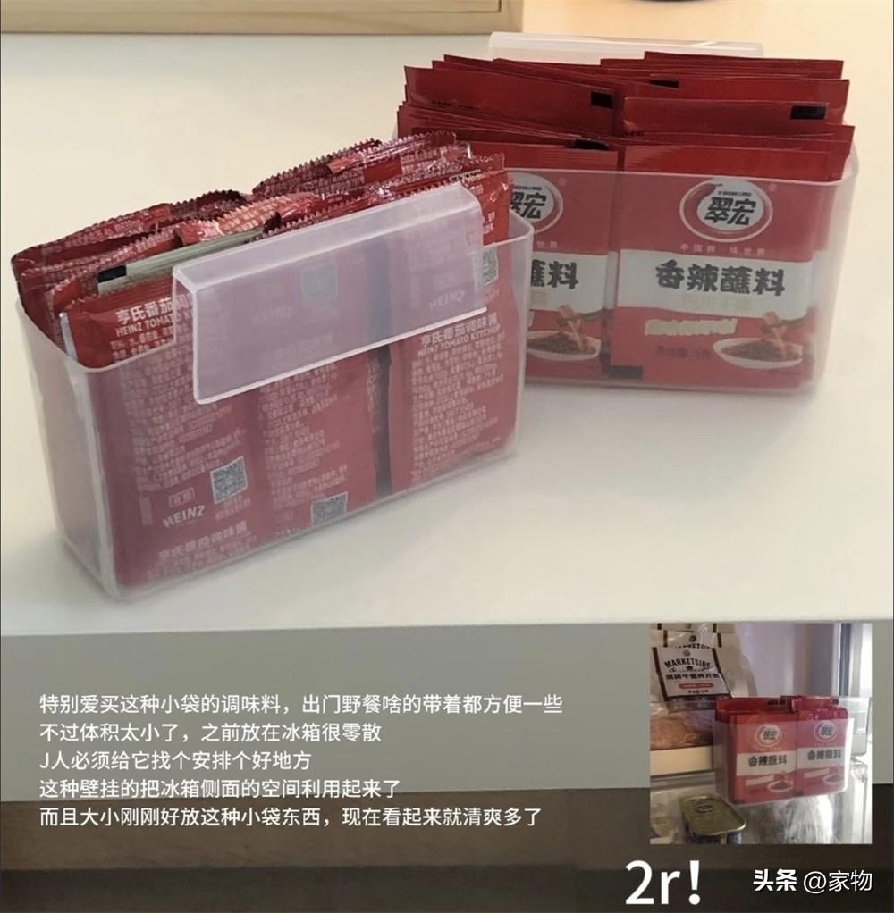 實際上,給冰箱門加個小收納盒就行,裏面塞上這些小袋的調味料,看起來整潔,拿着用也方便。