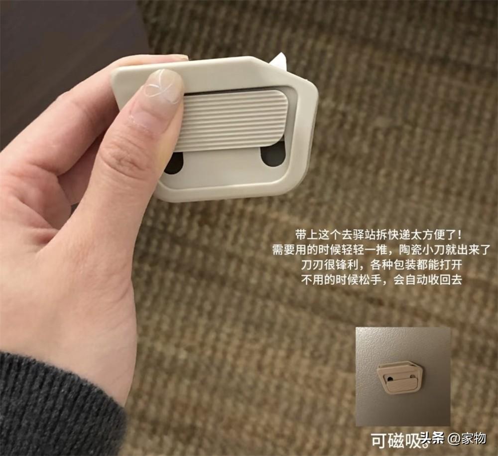 刃口鋒利卻很小一個,能在拆快遞的同時避免傷手,不用的時候收入“刀鞘”,再用磁吸扣吸附在冰箱或者其他位置就行。