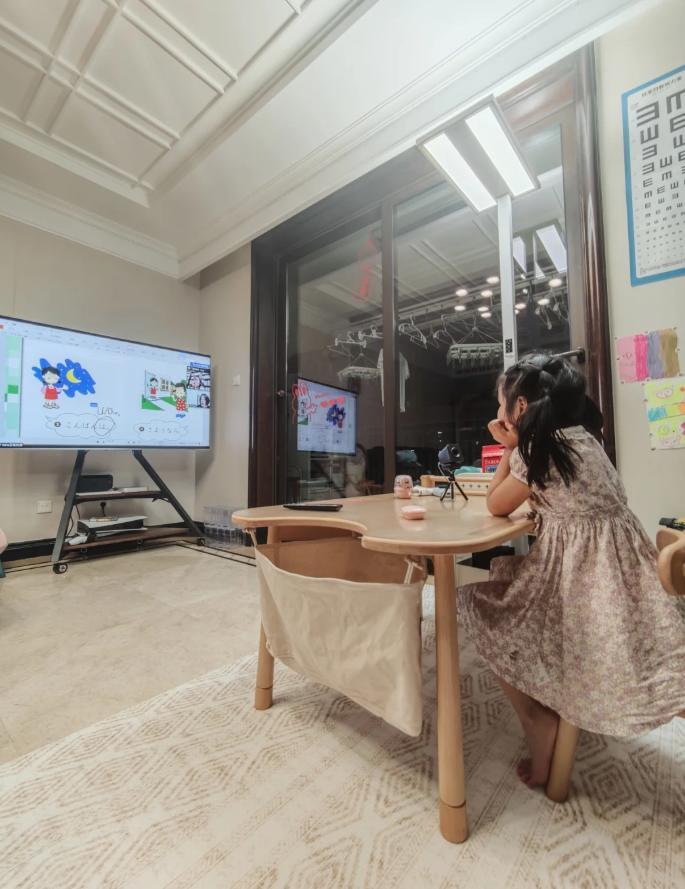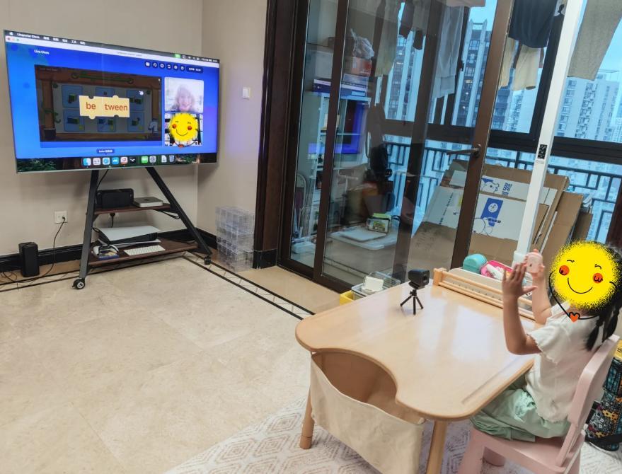 上海的一位媽媽,就用自家的65寸電視外加Macmini、無線攝像頭和無線鼠標,把電視機手搓成了寶貝上網課的神器。