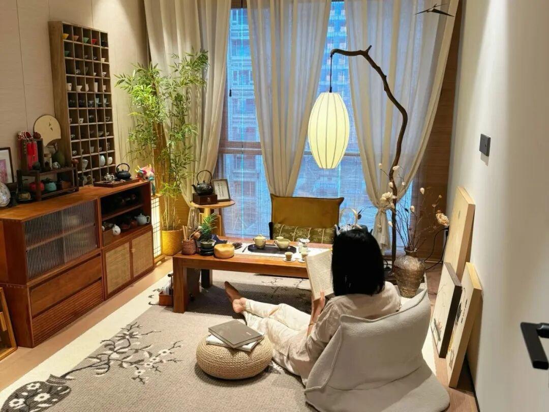而在陽臺的另一側,可以鋪上溫暖的防腐木地板,放着一張L型懶人沙發,或者是幾個蒲團,搭配一個小的茶几,瞬間就變成迷你茶室;也可以做成瑜伽區,冥想區。