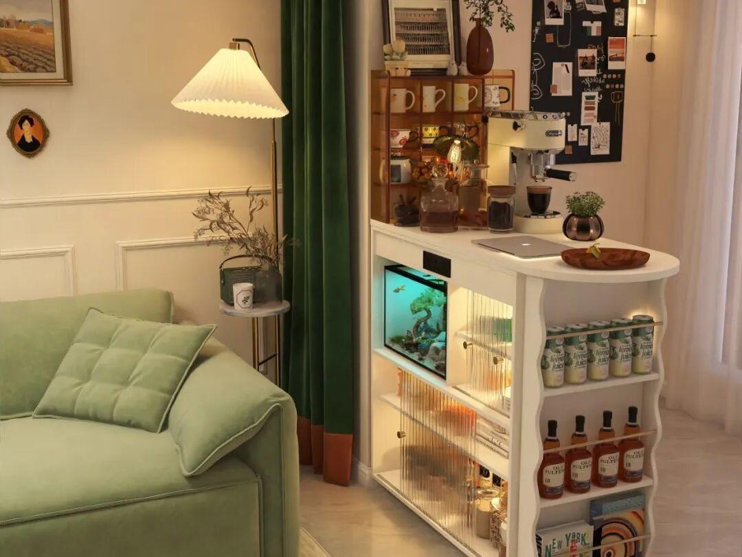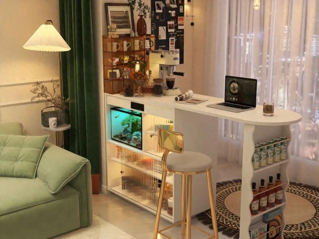 而吧檯的高度通常在90~110釐米之間,再搭配上極簡的高腳凳,氛圍感瞬間就出來了。而在上方還可以設計兩層簡易的隔板,用來放置酒杯,或者是放置綠植,也很好看。