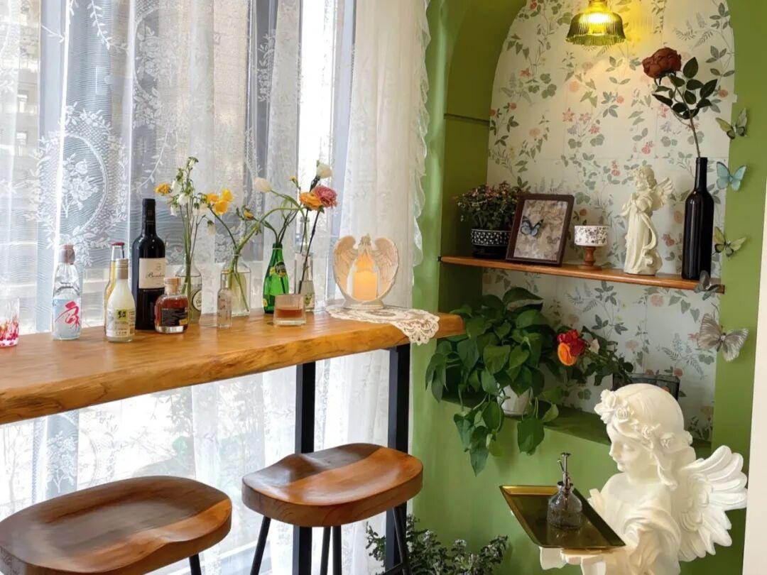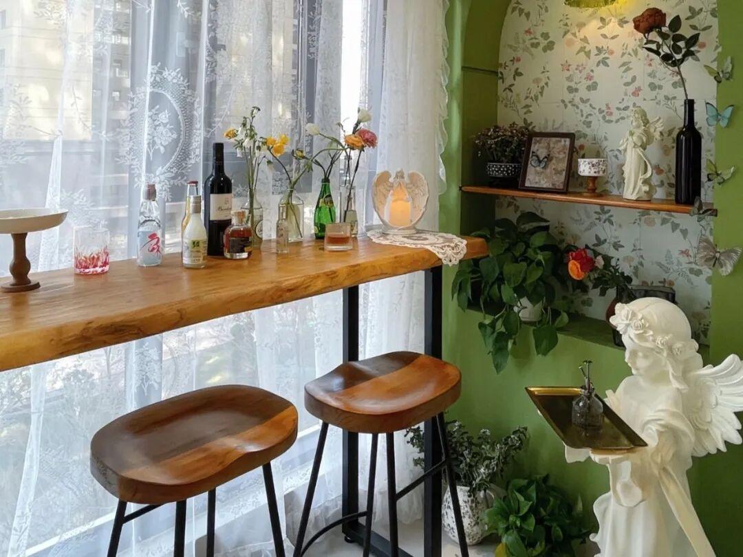 由於吧檯處在陽臺,吧檯檯面儘量選用巖板或者是防腐木,耐曬,且易於清潔,不要選擇普通板材。